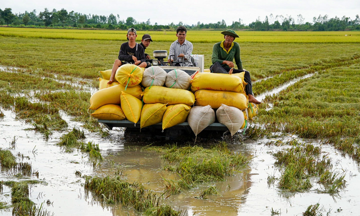 Gần ruộng ông Rẫy, ông Mai Quốc Toàn, 56 tuổi, trầm ngâm nhìn bờ bao mong manh quanh 2,2 ha lúa vụ 3 còn hơn 10 ngày nữa gặt, dưới trời mưa lớn. Hội ý nhanh với vợ, ông quyết định cho máy xuống ruộng ngập gần tấc nước gặt lúa non... chạy lũ. Con đường đá đỏ từ ruộng qua đồng lũ ngập nhiều đoạn, máy kéo phải trầy trật khi chở lúa về nhà.