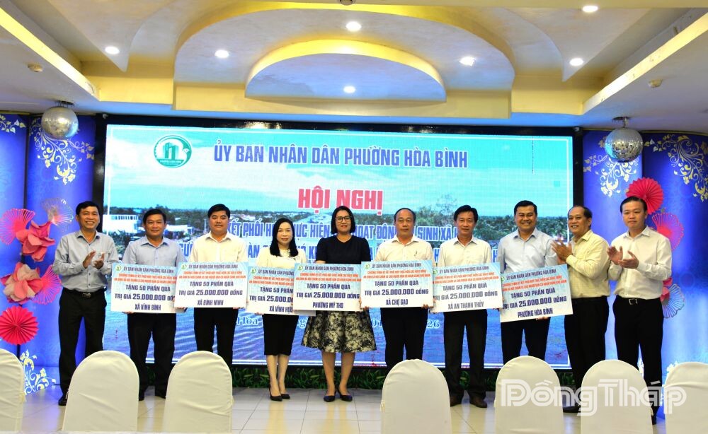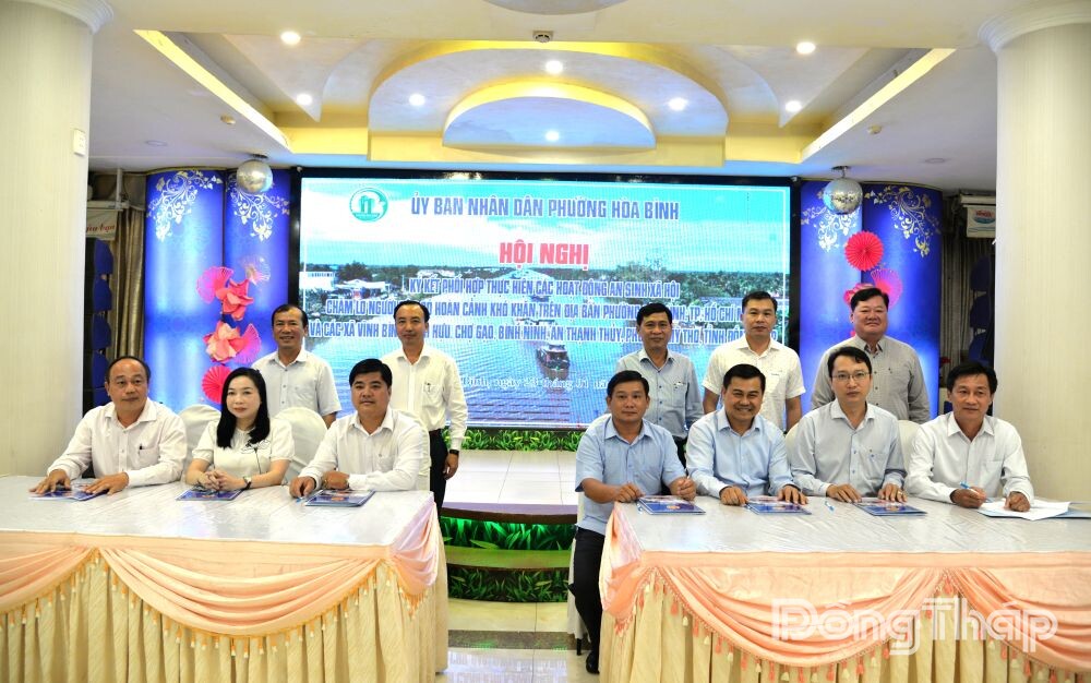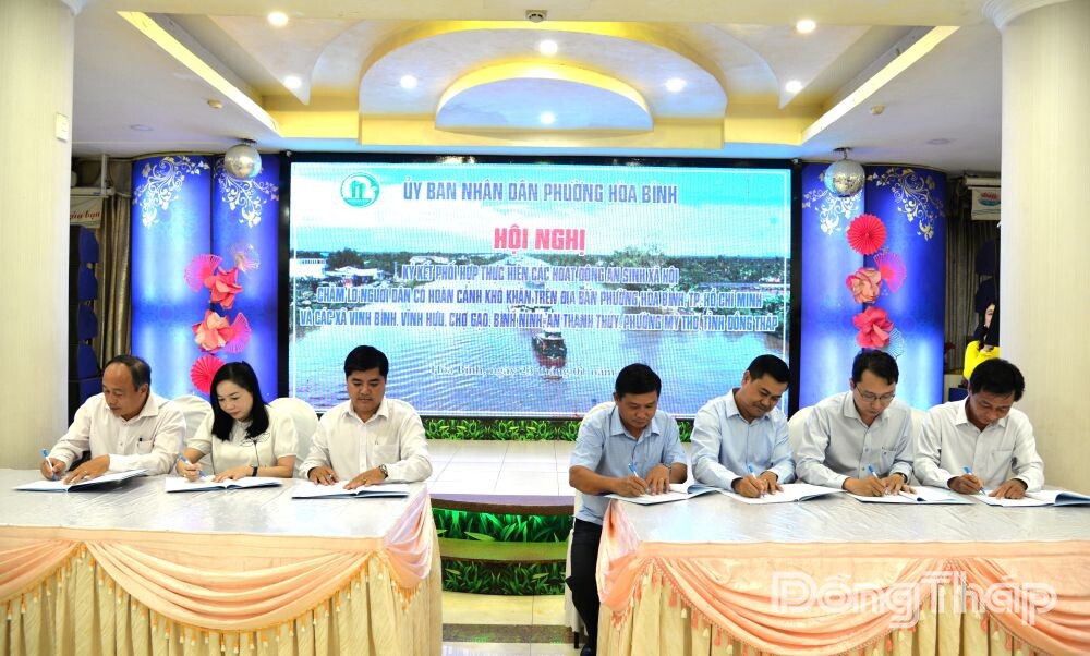 (ĐTO) Chiều 23-1, tại TP. Hồ Chí Minh, UBND phường Hòa Bình, TP. Hồ Chí Minh tổ chức Hội nghị ký kết phối hợp thực hiện các hoạt động an sinh xã hội chăm lo người dân có hoàn cảnh khó khăn trên địa bàn phường Hòa Bình, TP. Hồ Chí Minh và các xã Vĩnh Bình, Vĩnh Hựu, Chợ Gạo, Bình Ninh, An Thạnh Thủy và phường Mỹ Tho, tỉnh Đồng Tháp.