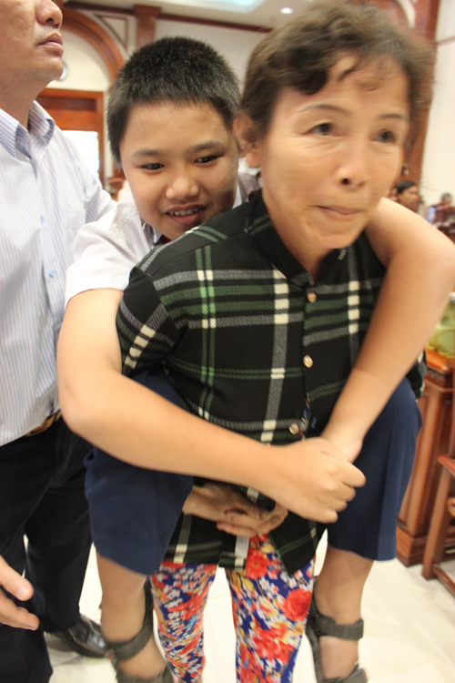 Để lại nhiều cảm xúc trong lòng mọi người tham dự buổi họp mặt là hình ảnh chị Lê Thị Hà, người phụ nữ nhỏ nhắn, cõng trên lưng cậu con trai Nguyễn Chung Vui bị khuyết tật, với đôi chân teo tóp, hoàn toàn mất khả năng đi đứng.