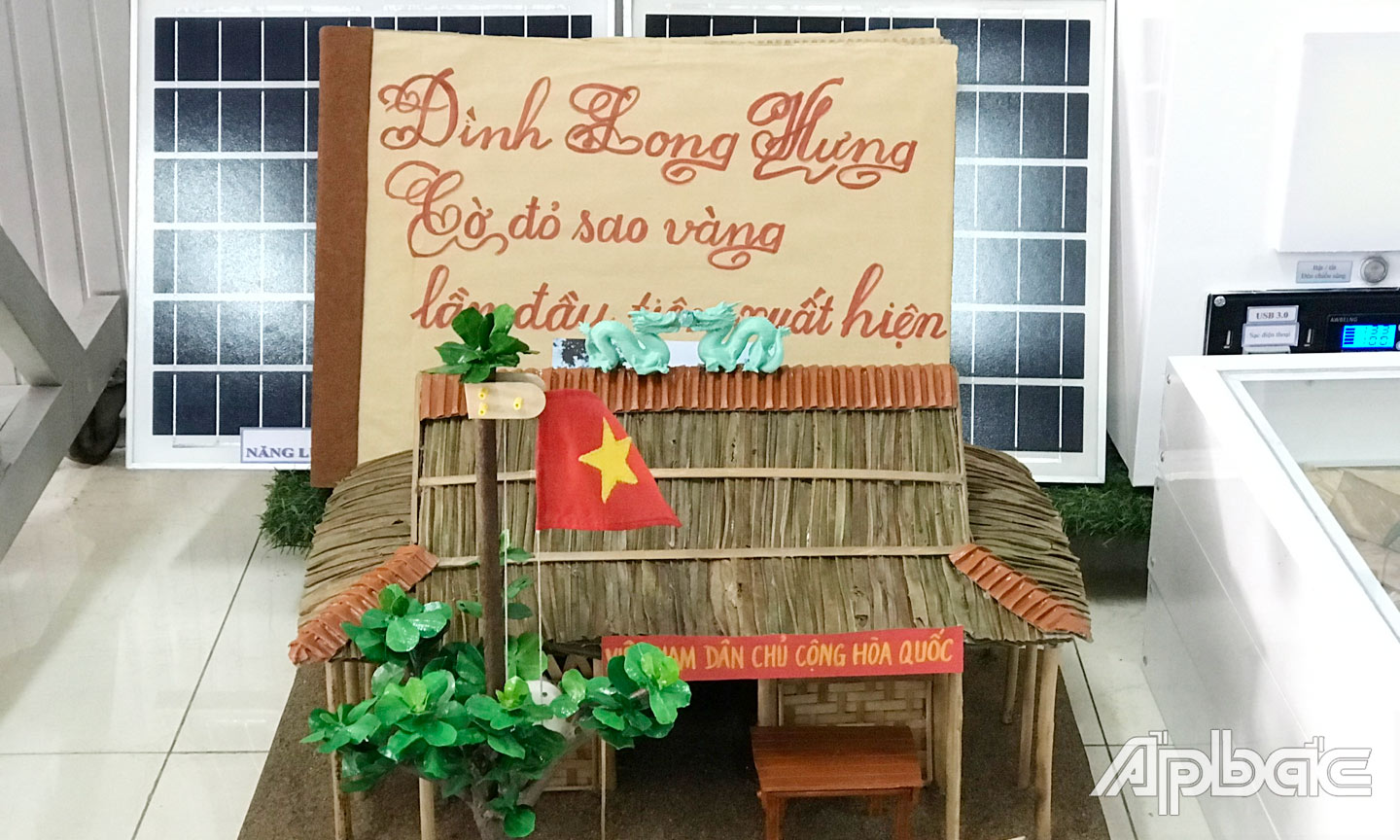 Trong đó, ngôi đình được lắp ghép từ các vật liệu như: Tre (cột, vách); lá trung quân (lợp mái); nền đất (sử dụng cát trộn với keo sữa); phía trước đình tái hiện bàn xử án của Tòa án nhân dân tỉnh Mỹ Tho. Đặc biệt, cây bàng trước cổng đình ngày trước được sử dụng làm cột cờ được em tái hiện bằng vật liệu thật (lá và nhánh cây bàng) có sử dụng mô-tơ điện mi ni vận hành 2 chiều để giương và hạ cờ.