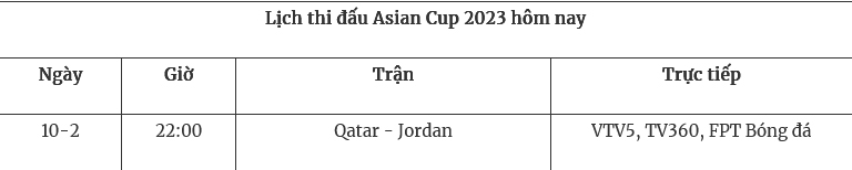 Lịch thi đấu Asian Cup 2023 hôm nay ngày 10-2 với tâm điểm là chung kết Qatar gặp Jordan diễn ra lúc 22 giờ.