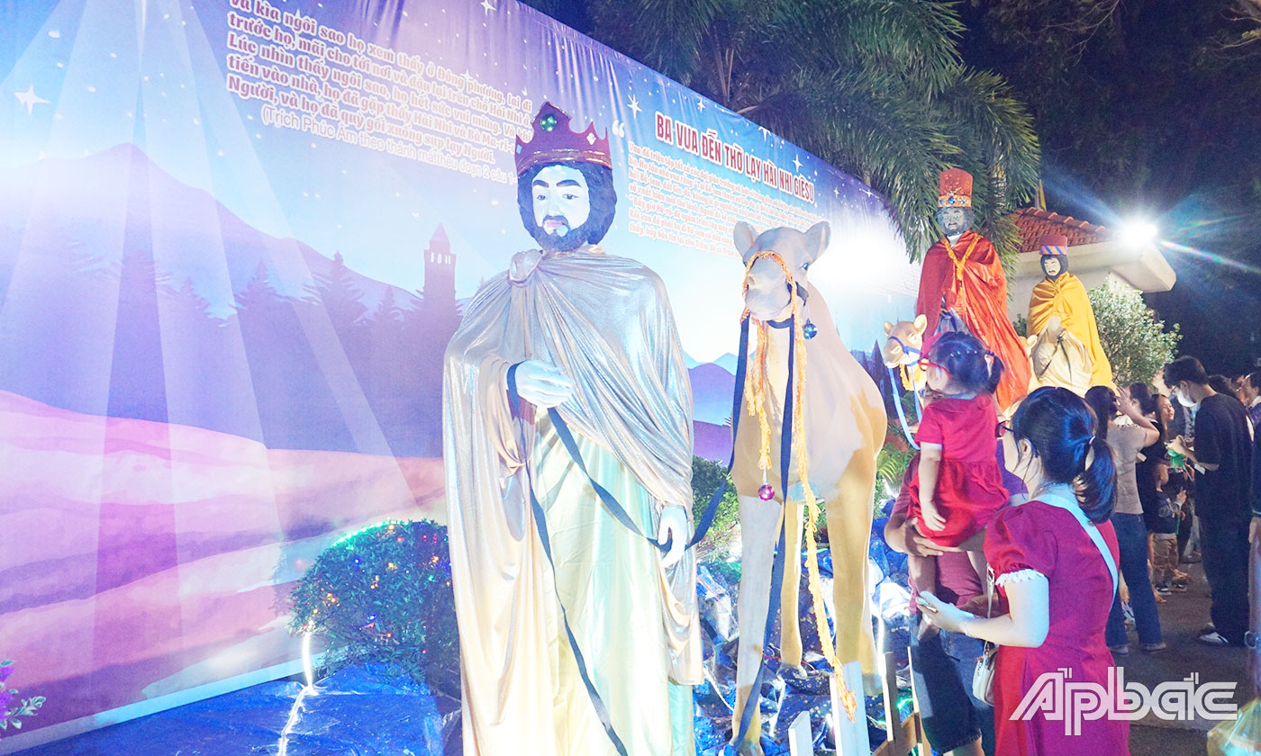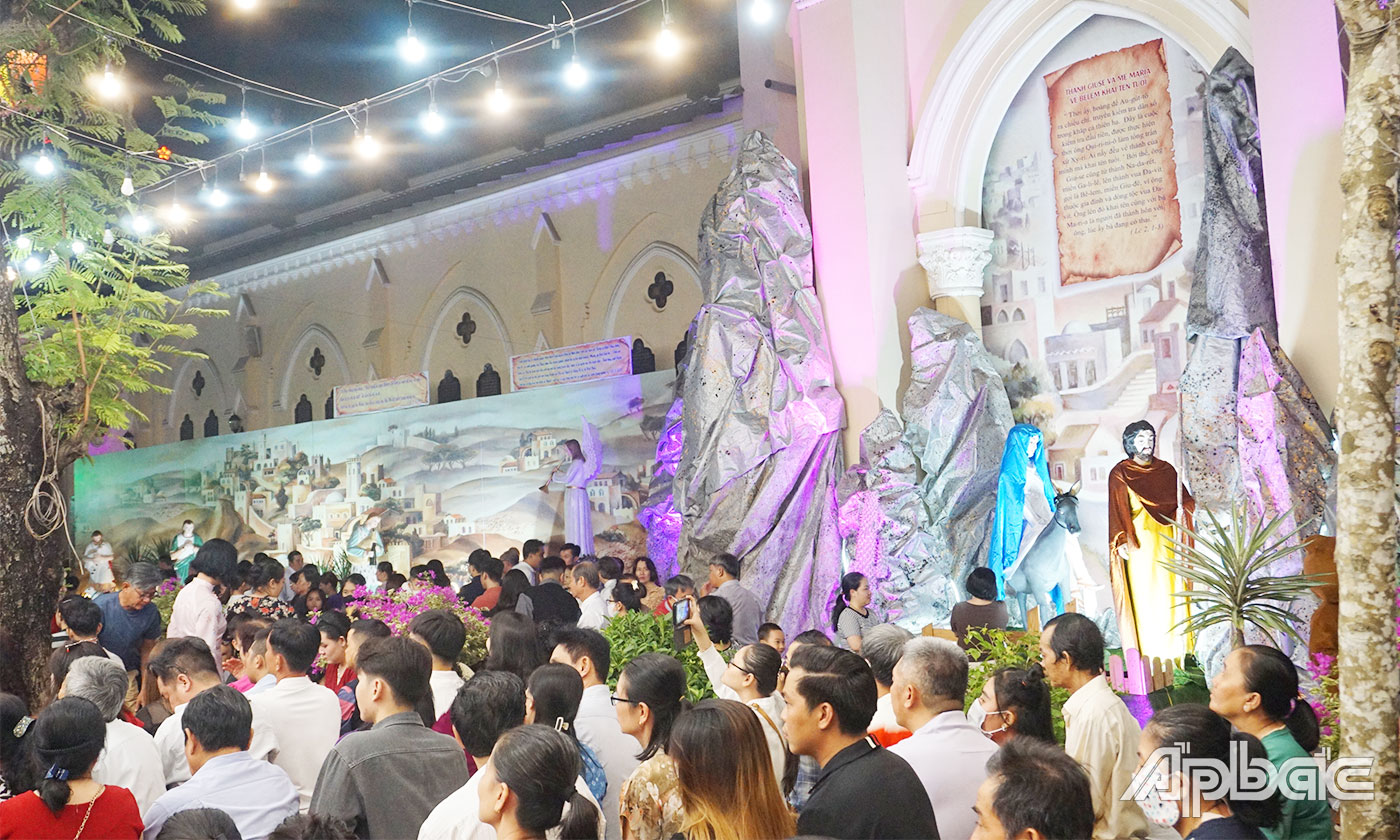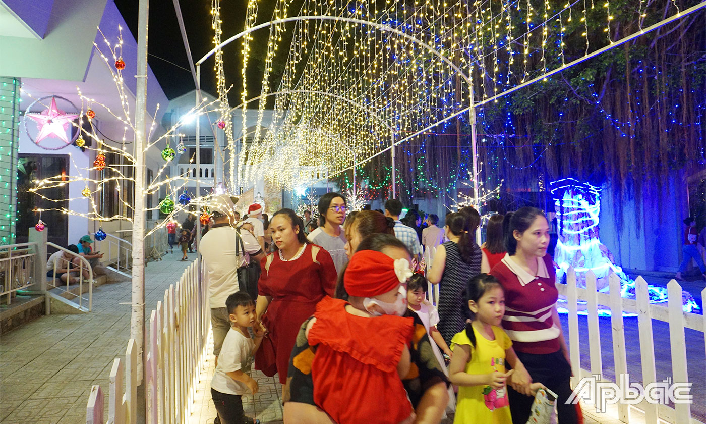 (ABO) Tối 24-12, không khí Giáng sinh tưng bừng, rộn rã. Các nhà thờ trên đường Hùng Vương, Lý Thường Kiệt tại TP. Mỹ Tho và các huyện của tỉnh Tiền Giang rực rỡ ánh đèn đón người dân đến làm lễ, vui chơi, đón một mùa Giáng sinh vui tươi, an lành.