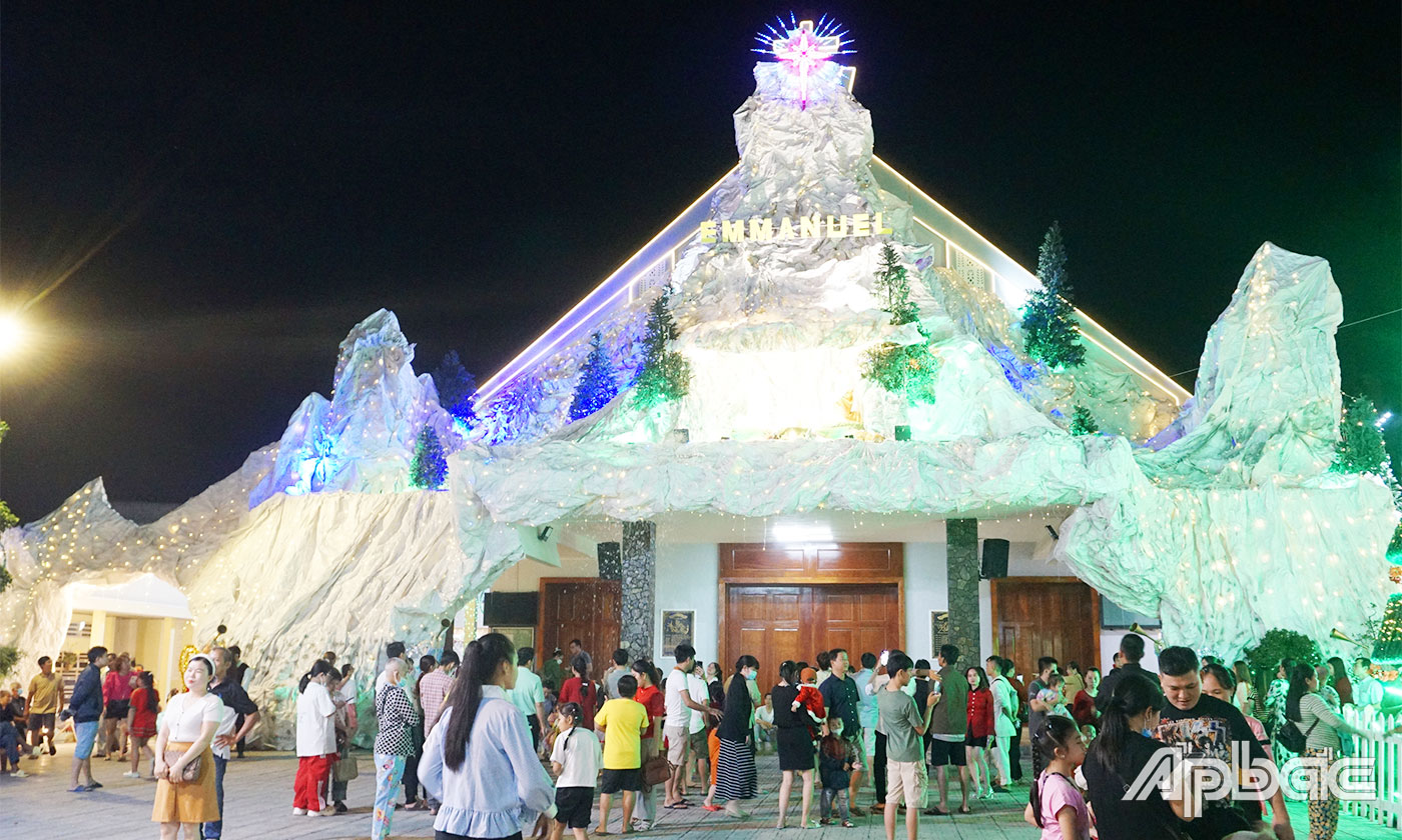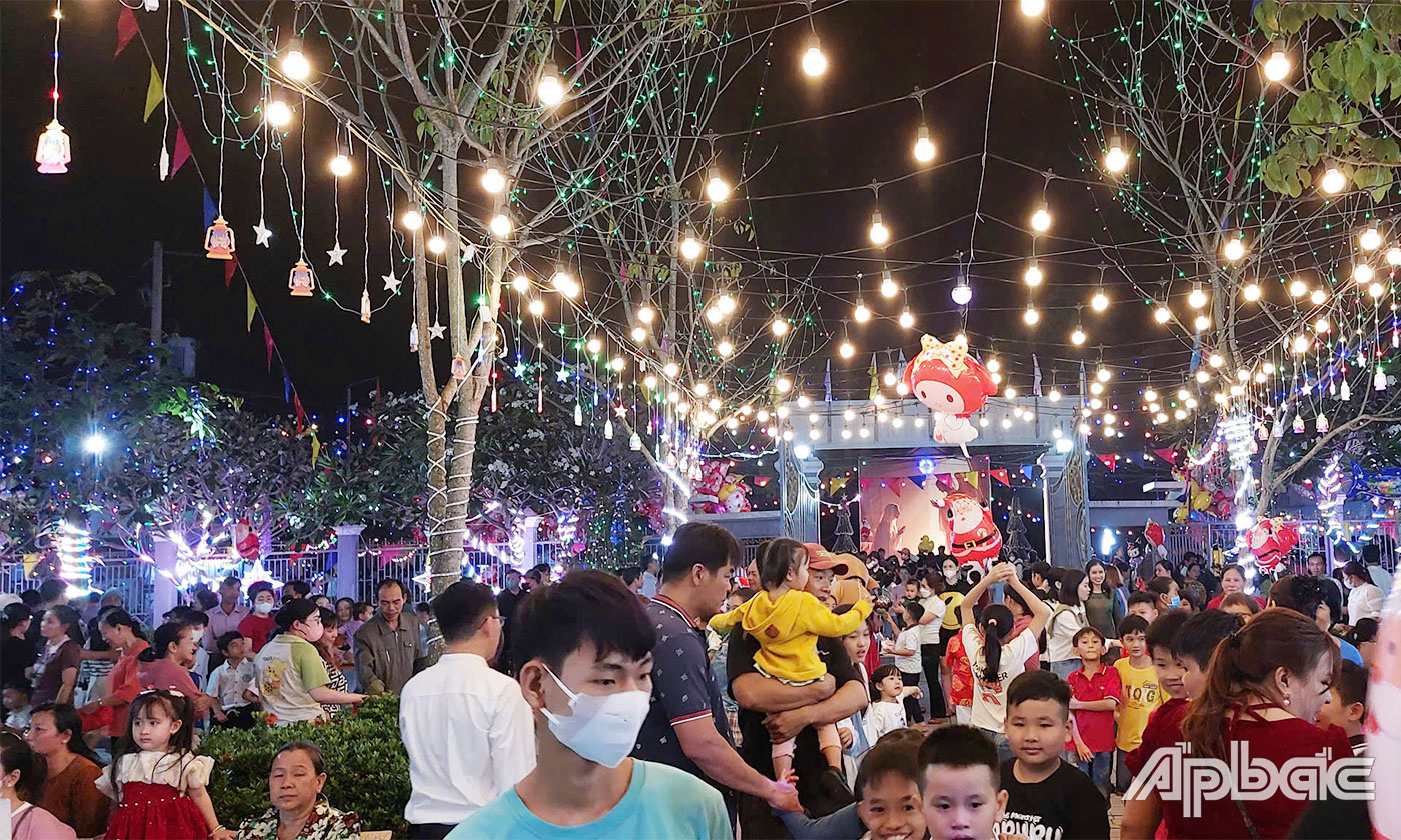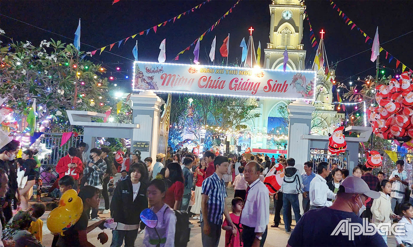 Tại xã Xuân Đông (huyện Chợ Gạo), trong đêm 24-12, có hàng trăm người dân đổ về Nhà thờ Giáo xứ Thủ Ngữ để cùng đón Giáng sinh. Khắp nơi vang lên giai điệu về ngày lễ Noel, chào mừng năm mới, cùng với đó là những khung cảnh rực rỡ, lung linh mang đến sự hân hoan cho mọi người.