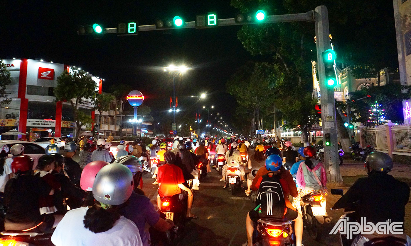 Để đảm bảo an toàn cho người dân tham gia đêm Giáng sinh, Công an tỉnh Tiền Giang, Công an TP. Mỹ Tho đã phối hợp với các cơ quan chức năng huy động hàng trăm cán bộ, chiến sĩ cắm chốt tại các điểm, ngã ba, ngã tư để đảm bảo trật tự, an toàn giao thông.