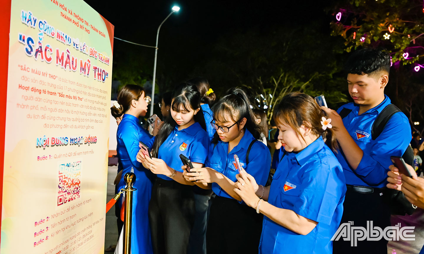 | Các bạn đoàn viên, thanh niên cùng tìm hiểu, tham gia vẽ bức tranh “Sắc màu Mỹ Tho”. |