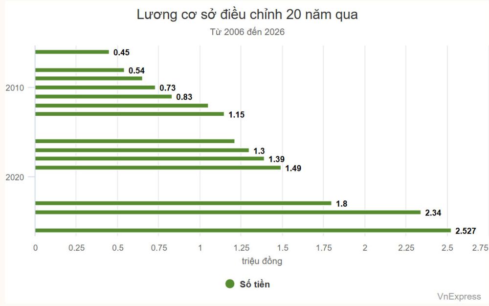 Tại buổi tiếp xúc cử tri ngày 9-3, Phó thủ tướng Phạm Thị Thanh Trà cho biết Chính phủ dự kiến điều chỉnh lương cơ sở từ 2,34 triệu đồng lên khoảng 2,527 triệu đồng mỗi tháng, tăng thêm 187.200 đồng. Đây là mức lương áp dụng với cán bộ, công chức, viên chức và lực lượng vũ trang hưởng lương từ ngân sách nhà nước, đồng thời là căn cứ xác định nhiều chế độ, chính sách trong khu vực công.