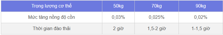Theo Viện Quốc gia về Lạm dụng Rượu và Nghiện rượu Mỹ, tốc độ đào thải cồn trung bình là 0,015% BAC mỗi giờ (BAC là nồng độ cồn trong máu). Tuy nhiên, tốc độ này có thể thay đổi tùy theo trọng lượng cơ thể, giới tính, tình trạng gan và mức độ hydrat hóa.