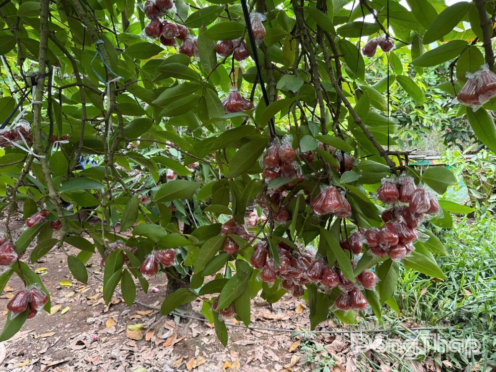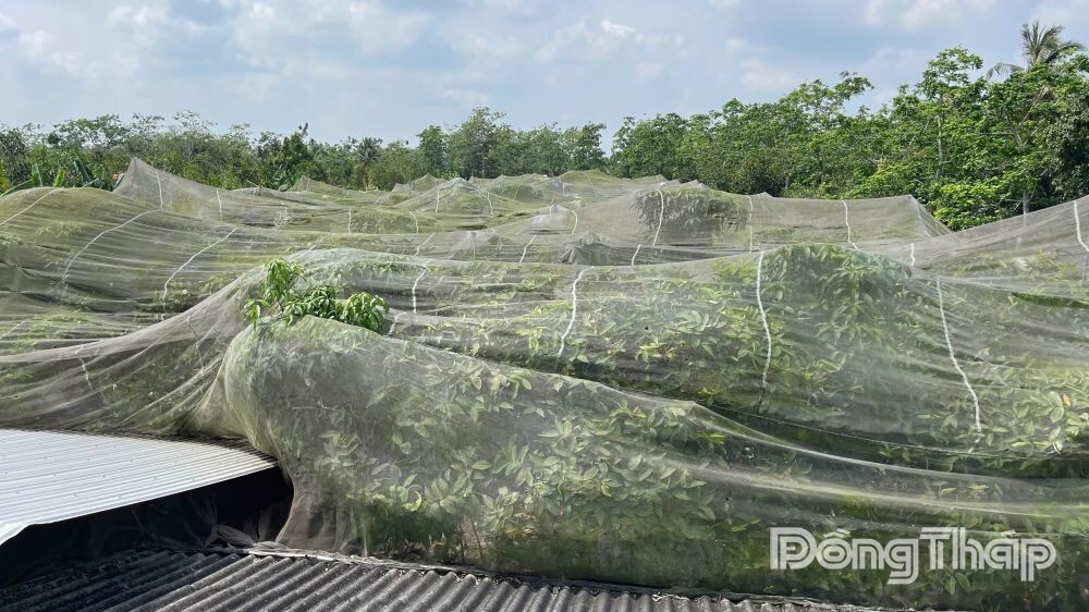 Theo ông Dũng, việc phủ lưới toàn vườn mang lại nhiều lợi ích rõ rệt. Trước hết, trong mùa thuận, mô hình này giúp giảm đáng kể chi phí và công lao động do không phải sử dụng túi ni lông để bao từng trái. Lớp lưới còn giúp giảm nhiệt độ trong vườn, giữ độ ẩm tốt, nhờ đó tiết kiệm khoảng 30% - 40% lượng nước tưới so với canh tác truyền thống.