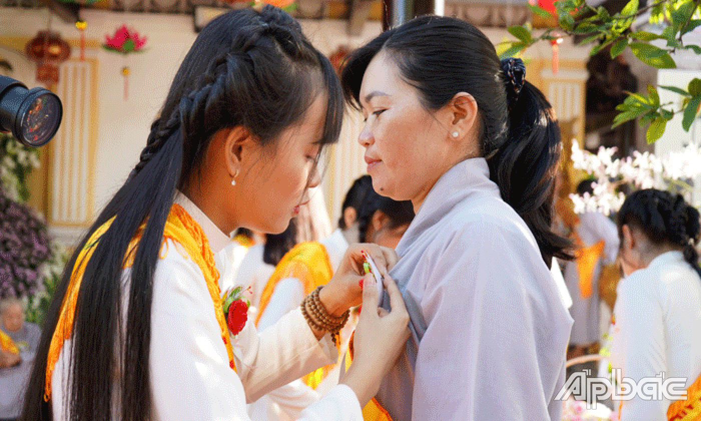 | Nghi thức "Bông hồng cài áo" được tổ chức tại chùa Sắc Tứ Linh Thứu (huyện Châu Thành). |