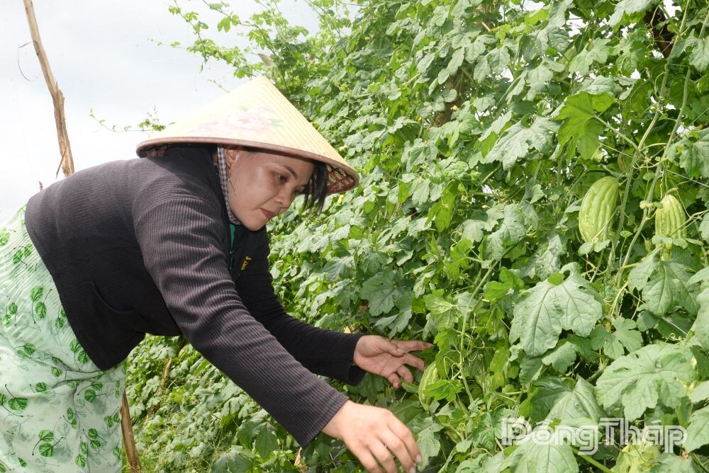 Thay vì trồng đơn canh, chị áp dụng phương pháp luân canh, đa dạng cây trồng theo mùa như: Khổ qua, mướp hương, bầu, bí và một số loại rau ăn lá ngắn ngày.