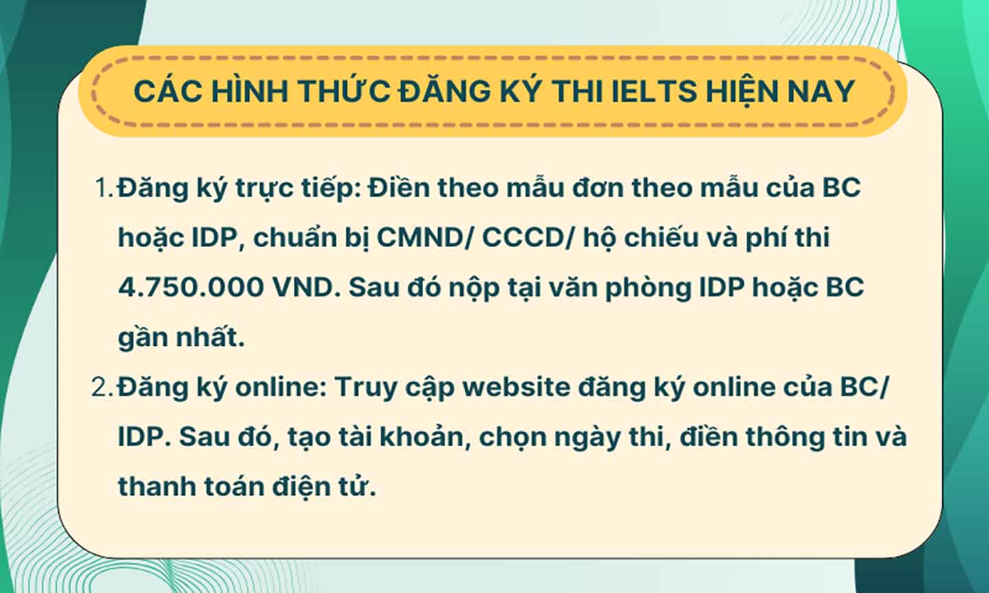 Hiện nay, bạn có thể đăng ký thi IELTS qua hai hình thức trực tuyến hoặc trực tiếp tại Hội đồng Anh (BC) và IDP. Nếu bạn ở xa, đăng ký online và thanh toán điện tử là lựa chọn tiện lợi dành cho bạn. Ngược lại, nếu không quen với hình thức trực tuyến, bạn có thể đến văn phòng của IDP hoặc BC để được hỗ trợ đăng ký.