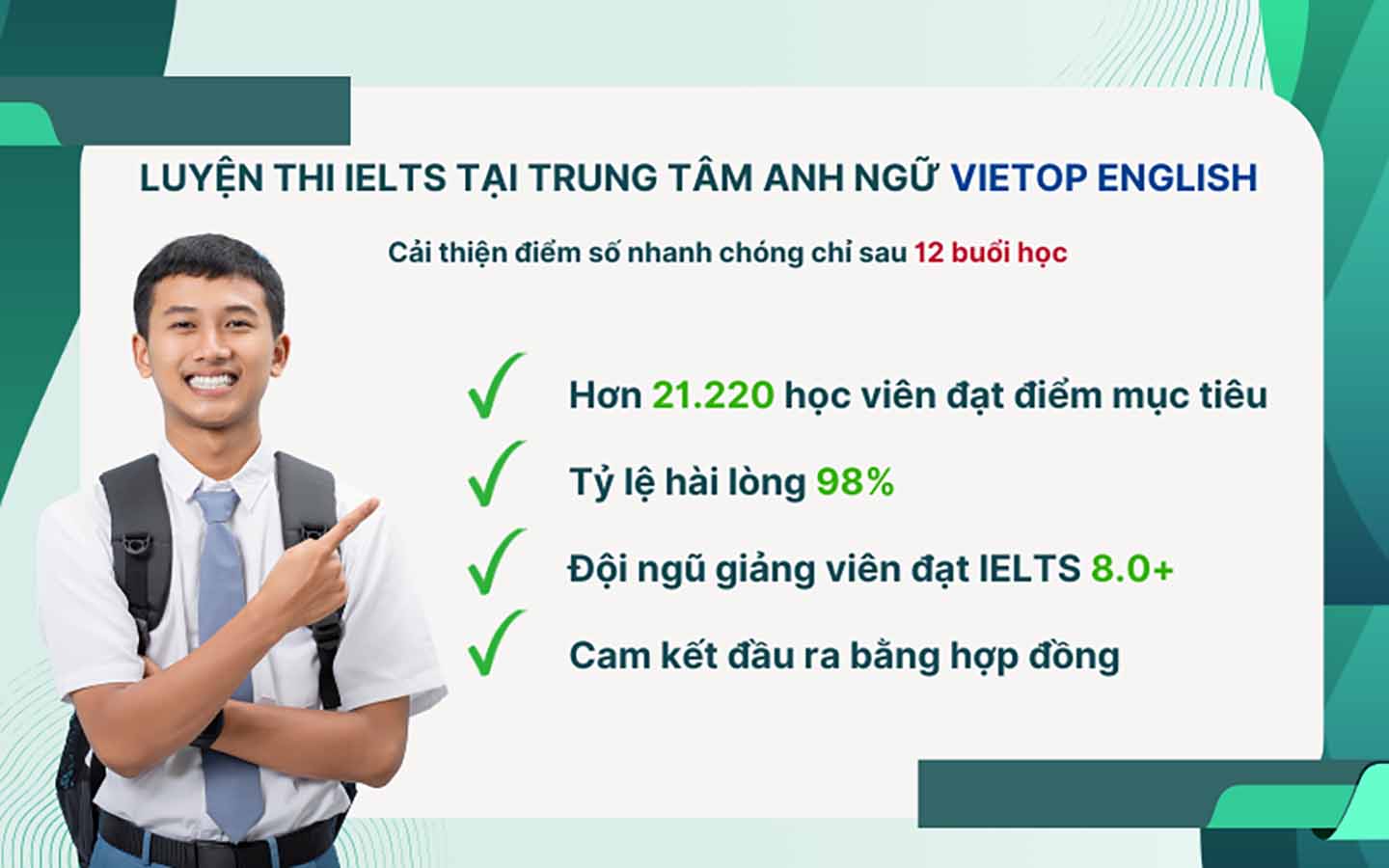 Vietop English luôn tự hào về hiệu quả đào tạo với hơn 21.220 học viên đạt điểm IELTS mục tiêu và tỷ lệ hài lòng đạt 98%. Đội ngũ giảng viên đều có trình độ chuyên môn cao, đạt IELTS 8.0+ nên trung tâm tự tin cam kết học viên sẽ đạt band điểm mục tiêu bằng hợp đồng rõ ràng.
