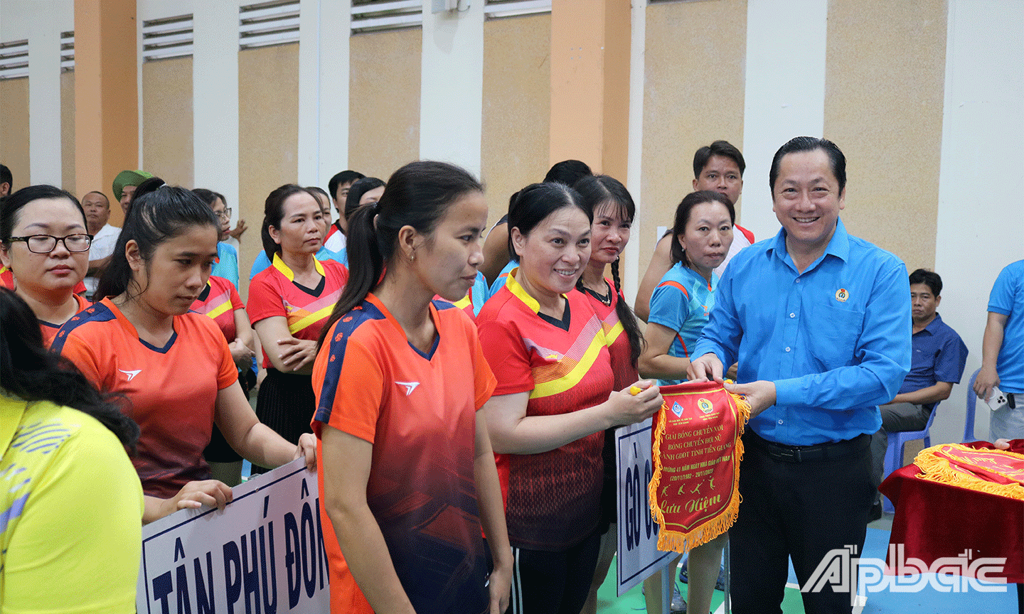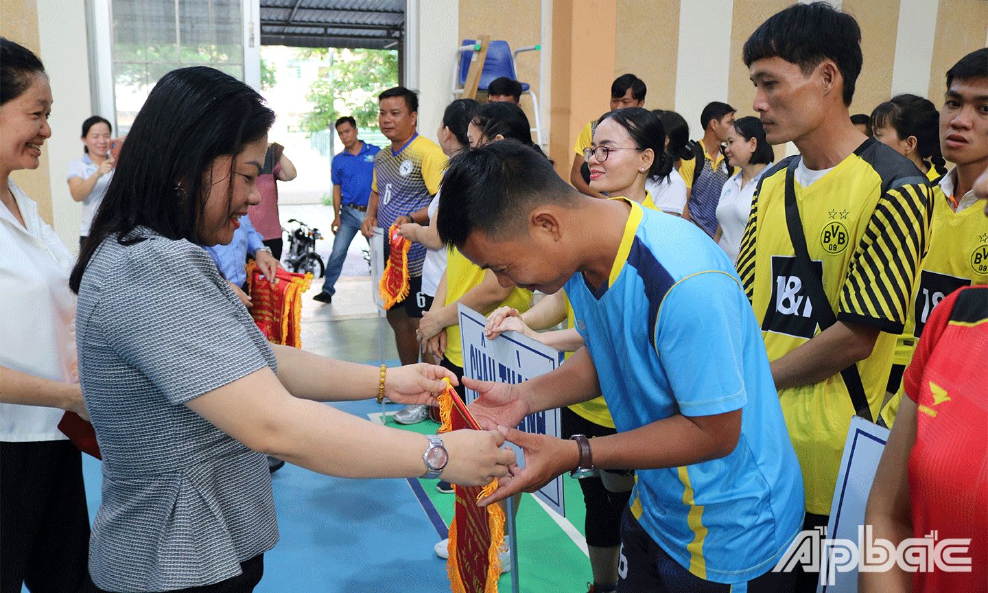| Ban Tổ chức trao giải Nhất bóng chuyền hơi nữ cho Đội huyện Cái Bè |