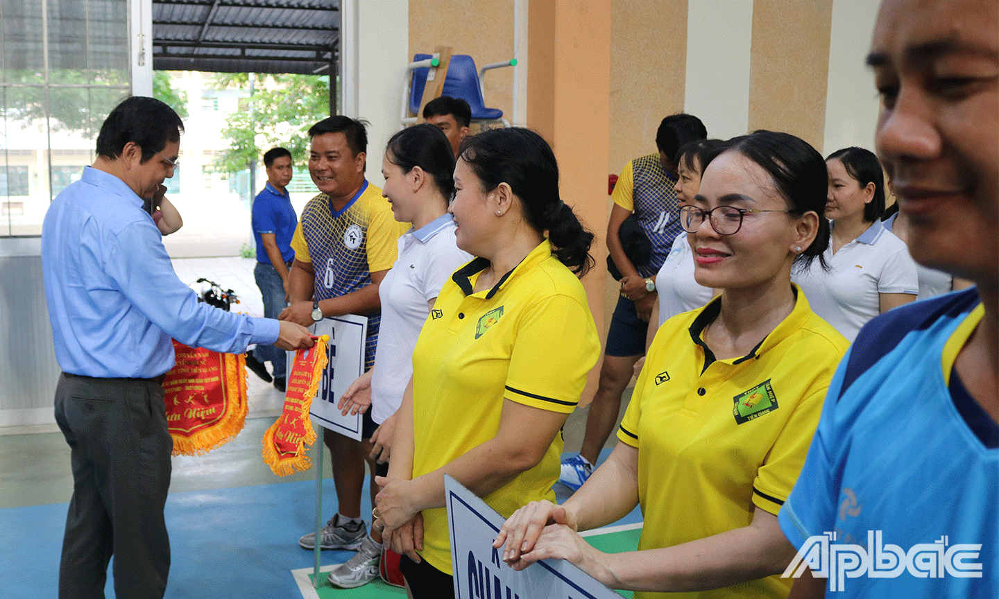 |  Ban Tổ chức trao Cờ lưu niệm cho các đội tham gia giải bóng chuyền. |