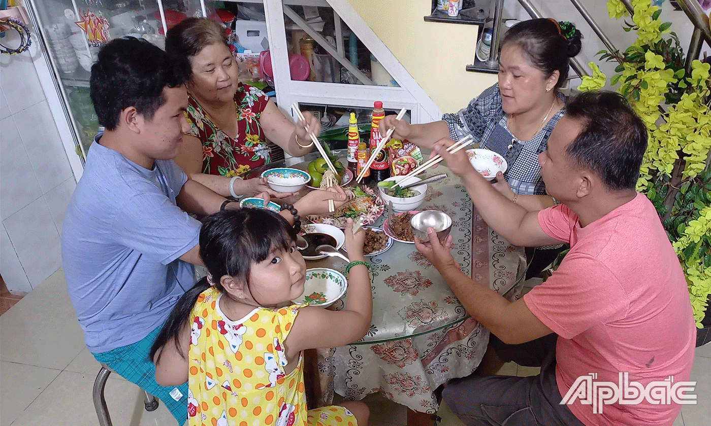 | Gia đình anh Ngô Chế Linh và chị Võ Bích Châu, xã Đồng Sơn (huyện Gò Công Tây, tỉnh Tiền Giang) luôn cố gắng duy trì bữa cơm hằng ngày với đầy đủ các thành viên. |