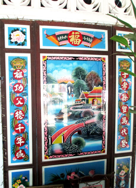 Liếc nhìn xung quanh nhà, tôi bắt gặp những bức tranh liễn thờ, tranh thờ các vị Phật với nhiều phong cách, đặc biệt là sự phối hợp màu sắc với nhũ vàng, kim tuyến và vỏ ốc xà cừ.