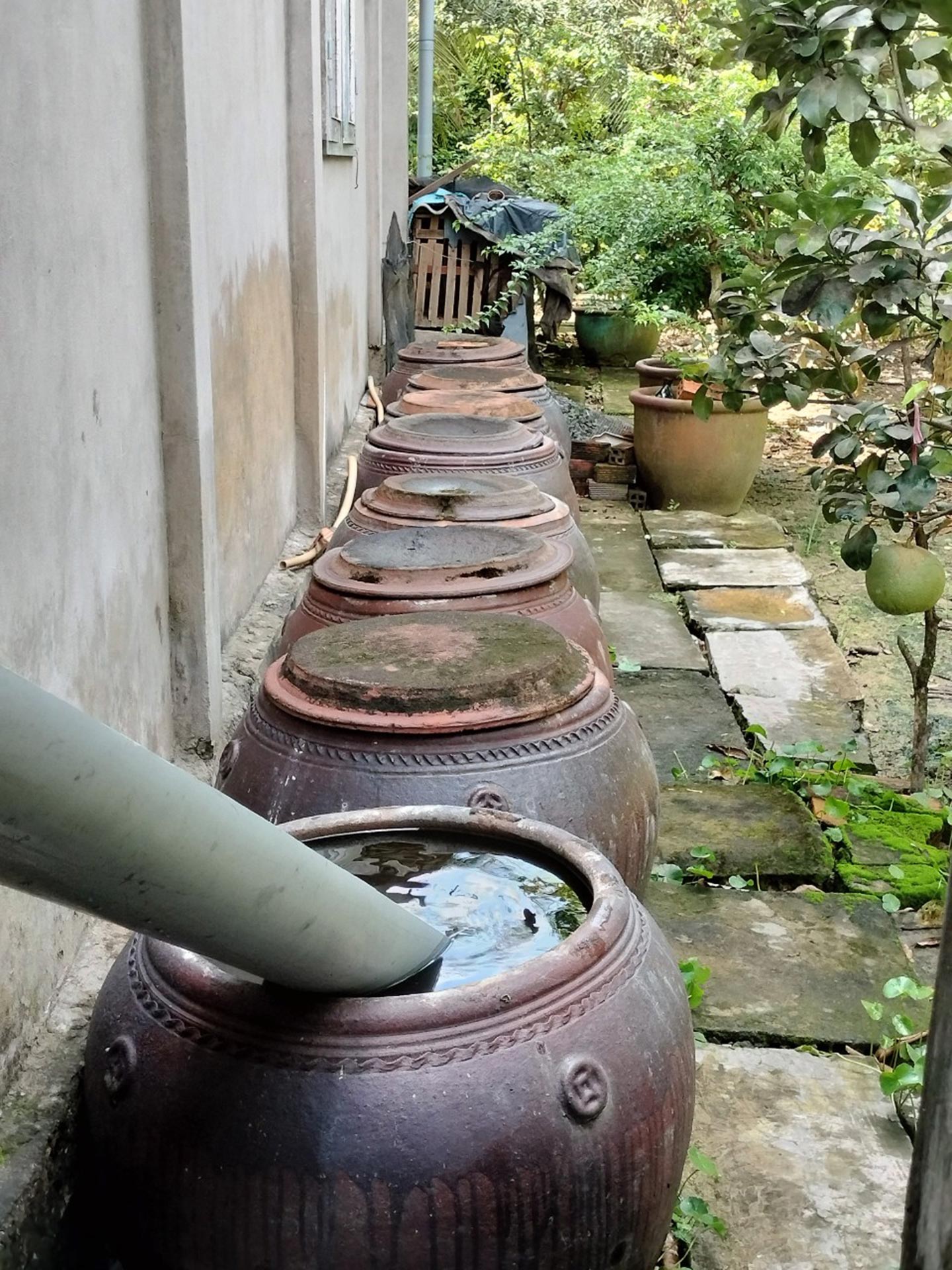 Ngoại sẽ bỏ một vài cơn mưa đầu mùa để dội rửa những bụi bẩn, lá cây trên mái nhà còn sót lại, sau đó dùng máng xối, một dạng ống dài nhưng cắt nửa, đầu chảy vào lu nước bọc vải mùng, đầu còn lại canh ngay đầu máng xối chỗ nước trên mái nhà chảy xuống, chừng chục cơn mưa lớn là đầy một hàng lu nước để dùng cho mùa nắng tới. Hứng đầy hàng lu nước mà trời vẫn còn vài cơn mưa lớn là ngoại chặc lưỡi đứng tần ngần tiếc lắm.