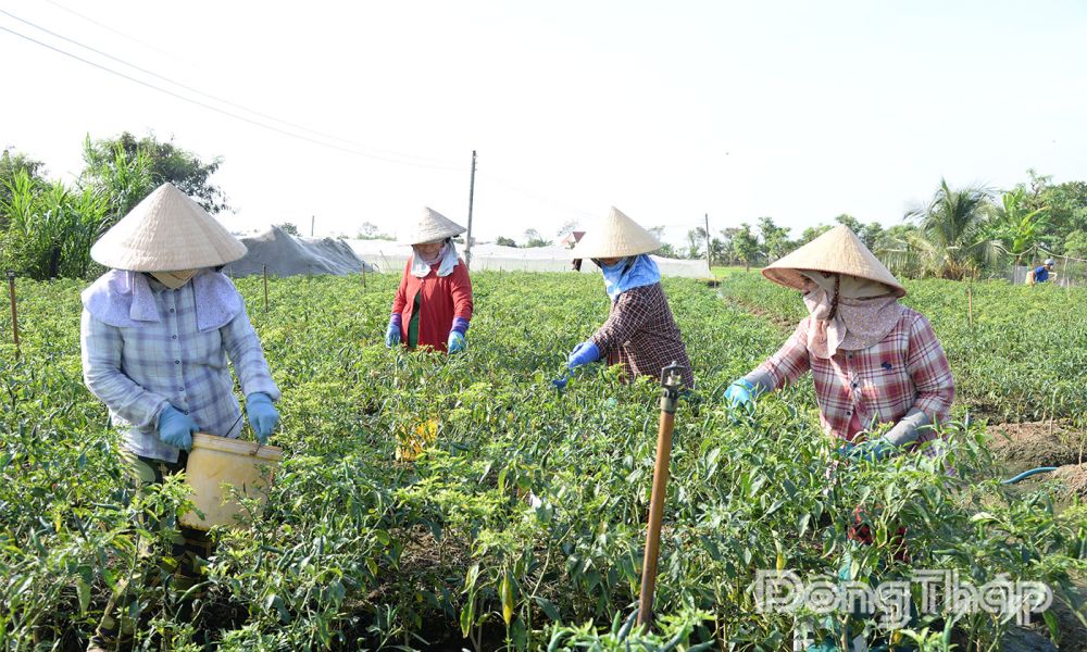 Gia đình bà Dương Thị Kim Nga (ấp Kinh Trên, xã Tân Điền, tỉnh Đồng Tháp) có trồng 2,2 công ớt. Khi chúng tôi đến là thời điểm bà Nga cùng nhân công đang khẩn trương thu hoạch ớt để bán cho thương lái. Theo bà Nga, vườn ớt của gia đình đến giai đoạn thu hoạch cách nay nửa tháng. Đến nay, bà đã thu hoạch được 7 đợt, trung bình 2 ngày 1 lần.