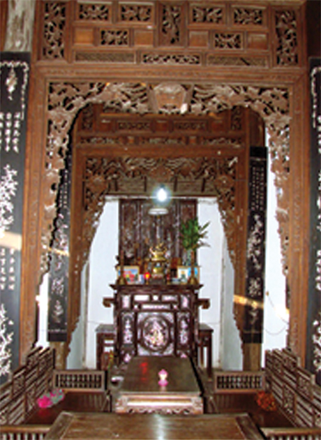 Vào bên trong ngôi nhà, phía trên gian giữa được trang trí bao lam hoa mẫu đơn và chim trĩ cùng 12 khuôn trang trí chạm trái lê, lựu, na; cửa võng chạm cuốn thư, mướp khía, dây lá và chim; phía dưới trang trí bộ trường kỷ chạm trổ đề tài tứ quý, hoa, trái cây, chim, dây lá, con tiện và bàn nghi chạm 4 mặt các đề tài trái phật thủ, lê, lựu, con dơi, chim phượng, kỳ lân chở bát quái. Gian trái, phải, phía trên được trang trí bao lam chạm các đề tài trái phật thủ, lê, lựu, con tiện, chim trĩ, hoa mai, mẫu đơn, hoa văn chữ Vạn…; trên các cột gắn liễn câu đối chữ Hán và cúc, điểu đều được khảm xà cừ rất tinh xảo; phía dưới trang trí, bày biện tủ thờ khảm xà cừ đề tài tứ quý (mai, lan, trúc, cúc) rất tỉ mỉ và độc đáo.