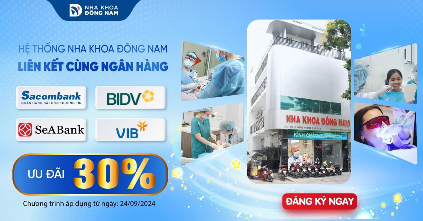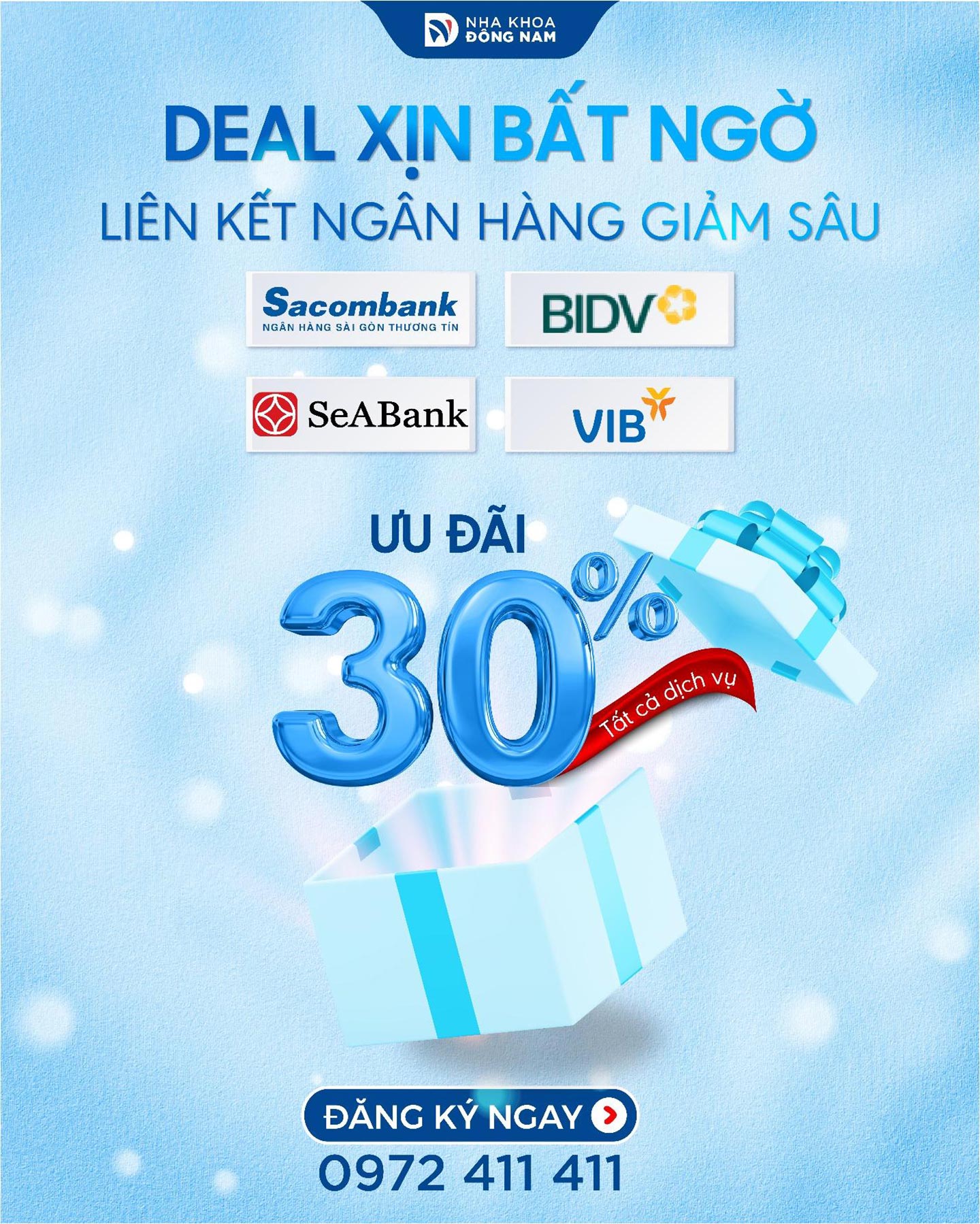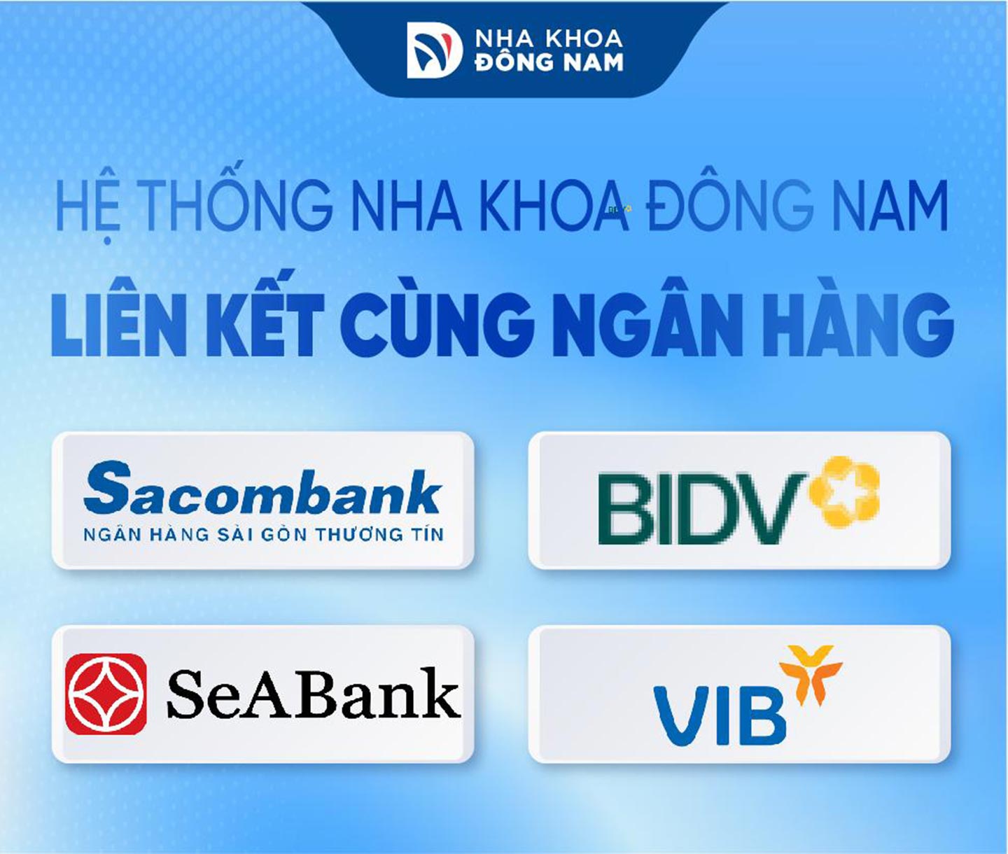 Đặc biệt, chương trình "Liên kết ngân hàng" của Nha khoa Đông Nam còn mở rộng liên kết với các ngân hàng lớn khác gồm Sacombank, VIB và BIDV. Vì vậy, chỉ cần sở hữu thẻ của một trong bốn ngân hàng SeAbank, Sacombank, VIB hoặc BIDV, khách hàng sẽ được giảm ngay 30%.