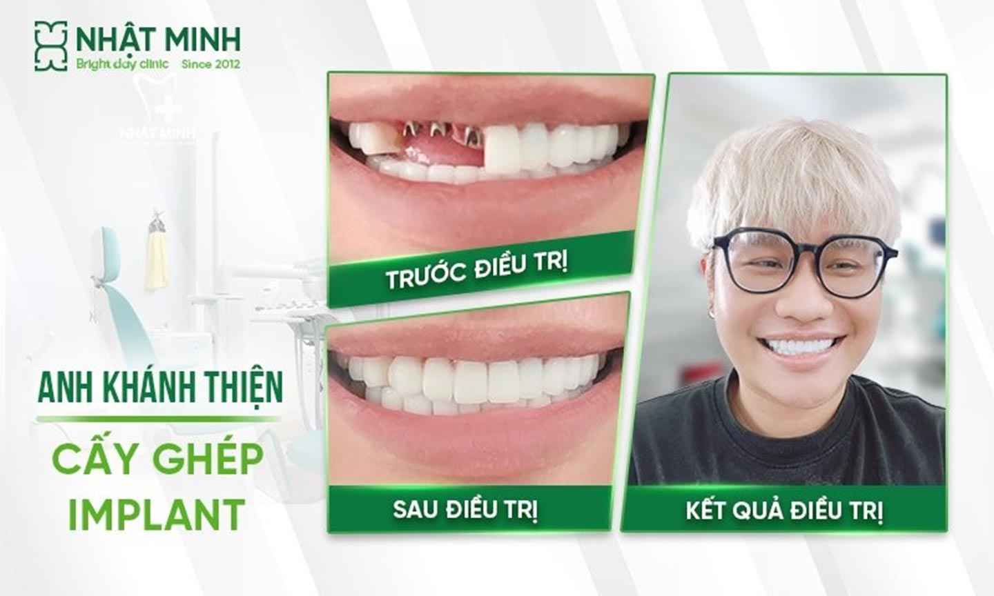 Khánh Thiện (sinh năm 1993) đã từng làm răng sứ và điều trị tủy cách đây 6 năm và hiện tại bị gãy 2 răng số 11 và 12. Khánh Thiện cho biết, anh đến Trung tâm Nha khoa Nhật Minh chi nhánh Bến Tre sau khi bị nhiều phòng khám nha khoa khác lần lượt từ chối.
