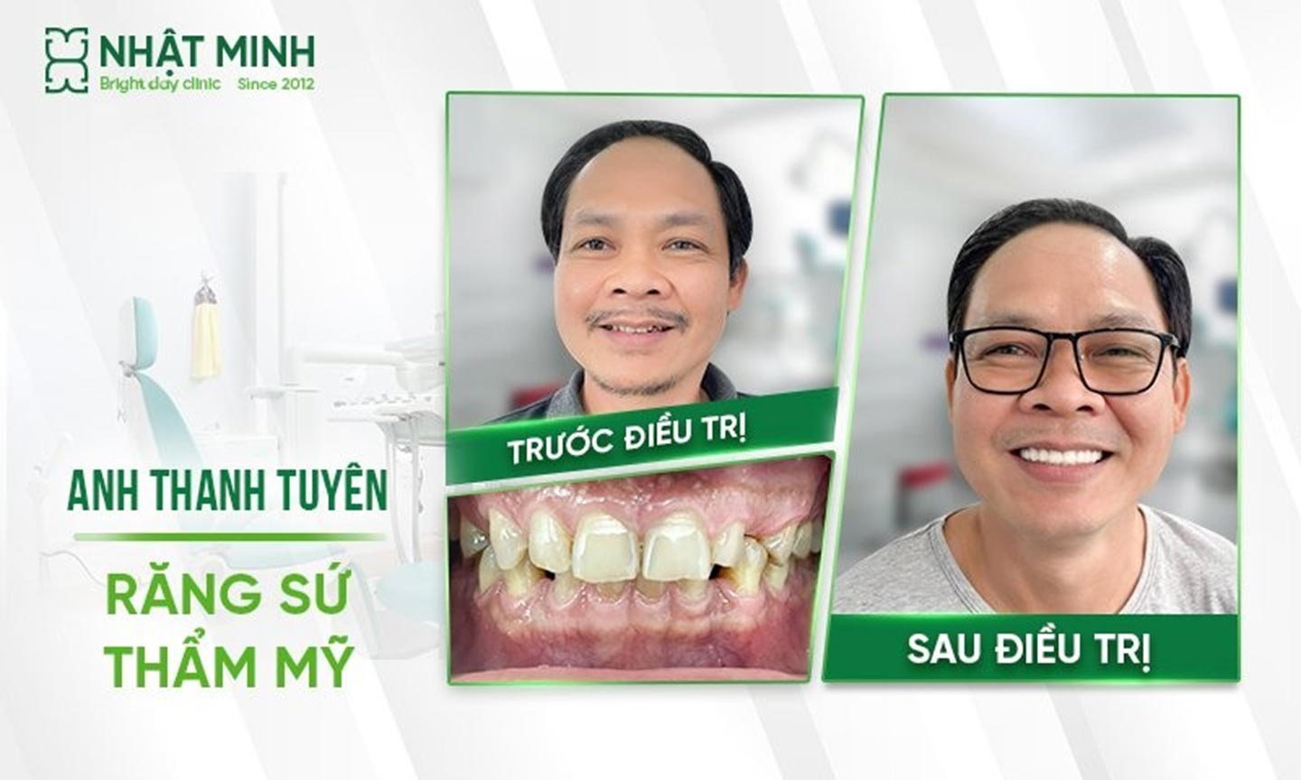 Bên cạnh đó, dịch vụ phục hình răng sứ thẩm mỹ của Nha khoa Nhật Minh cùng nhiều ưu điểm vượt trội về chất lượng, dịch vụ, công nghệ đã đồng hành và giúp nhiều khách hàng tự tin tỏa sáng với nụ cười đẹp rạng ngời. Thanh Tuyên (sinh năm 1973) gặp tình trạng răng ố vàng, không đều, thưa và ngắn khiến anh mất tự tin, ngại giao tiếp với bạn bè, đối tác. Thanh Tuyên cho biết, điều này khiến anh đánh mất nhiều cơ hội trong công việc và cuộc sống.