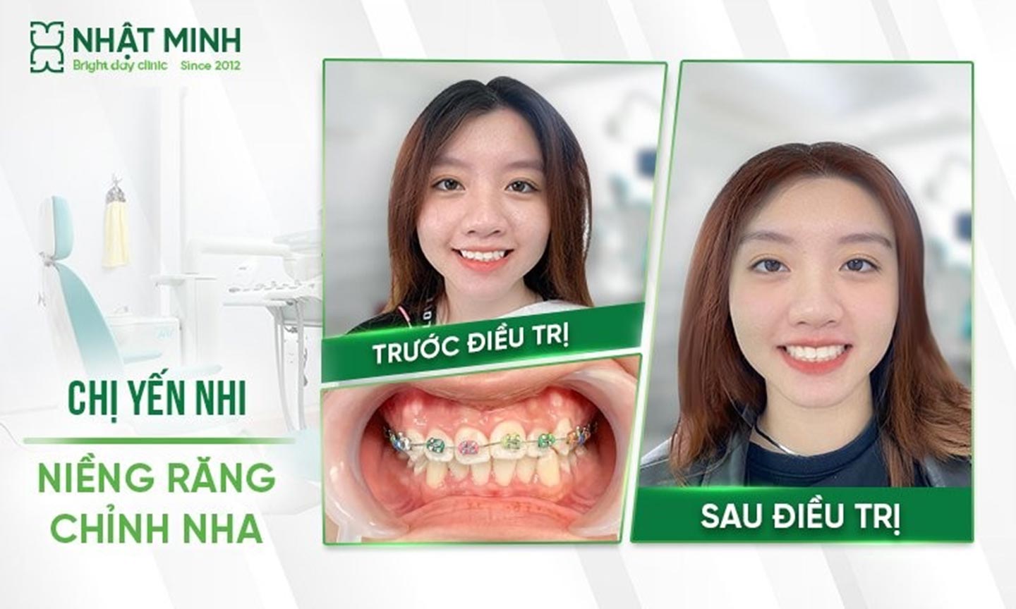 Ngoài ra, niềng răng, chỉnh nha cũng là một trong những dịch vụ nổi bật của Hệ thống Trung tâm Nha khoa Nhật Minh, nhận được sự tin tưởng của hàng nghìn khách hàng. Yến Nhi (sinh năm 2002) cho biết cuộc sống của chị đã có nhiều thay đổi kể từ khi niềng răng tại Nha khoa Nhật Minh. Trước đây, chị cảm thấy mất tự tin vì răng nhỏ, không đều, khớp cắn lệch, hô hàm trên khiến khuôn mặt không cân đối.