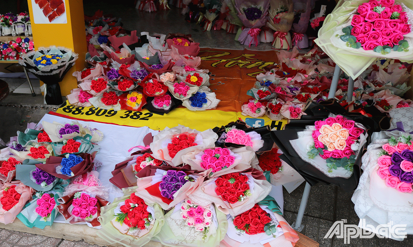 Còn chị Nguyễn Thị Hằng, chủ cửa hàng hoa sáp trên đường Lý Thường Kiệt (TP. Mỹ Tho) cho biết, hoa năm nay cũng đa dạng mẫu mã, chị thiết kế mới lạ hơn là có trang trí thêm họa tiết như gấu len, gấu dâu... Các bó hoa có loại màu nhẹ nhàng, có bó nhiều màu sắc, hoa chủ đạo vẫn là hoa sáp và kim tuyến, giá dao động từ 10.000 đồng đến hơn 1 triệu đồng/bó, tùy loại. Sức mưa năm nay cũng tương đương năm trước.