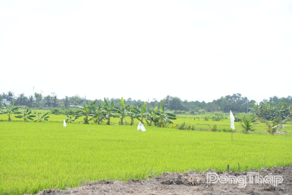 Lúc chúng tôi đến cũng là thời điểm ông Lê Văn Hoàng (khu phố Thành Nhứt, phường Bình Xuân) đang đi thăm đồng. Vụ đông xuân năm nay, 5 công đất của gia đình ông Hoàng gieo sạ giống lúa Đài Thơm 8. Hiện trà lúa đang trong giai đoạn làm đòng, chuẩn bị trổ. Ngay từ ngày mùng 3 tết, ông Hoàng đã bắt đầu ra thăm đồng để xem ruộng lúa có bị dịch hại hay không.