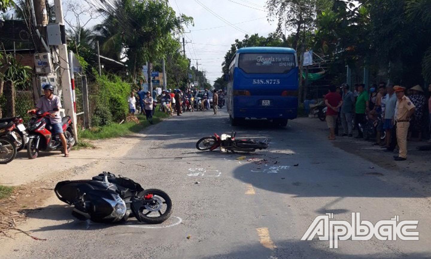 Theo thông tin ban đầu, chị Võ Tường Duy (sinh năm 1996, ấp Thới, xã Đông Hòa, huyện Châu Thành) điều khiển xe máy biển số 71F2-1796 lưu thông hướng Vĩnh Kim ra Quốc lộ 1. Khi đến đoạn trên, xe máy của chị Duy lấn trái đường vượt xe ô tô khách biển kiểm soát 53S-8775 do Nguyễn Vũ Quang (sinh năm 1989, ngụ xã Thạnh Phú, huyện Châu Thành) điều khiển thì va chạm với xe máy 63B3-537.48 do Nguyễn Hoàng Anh điều khiển hướng ngược lại.