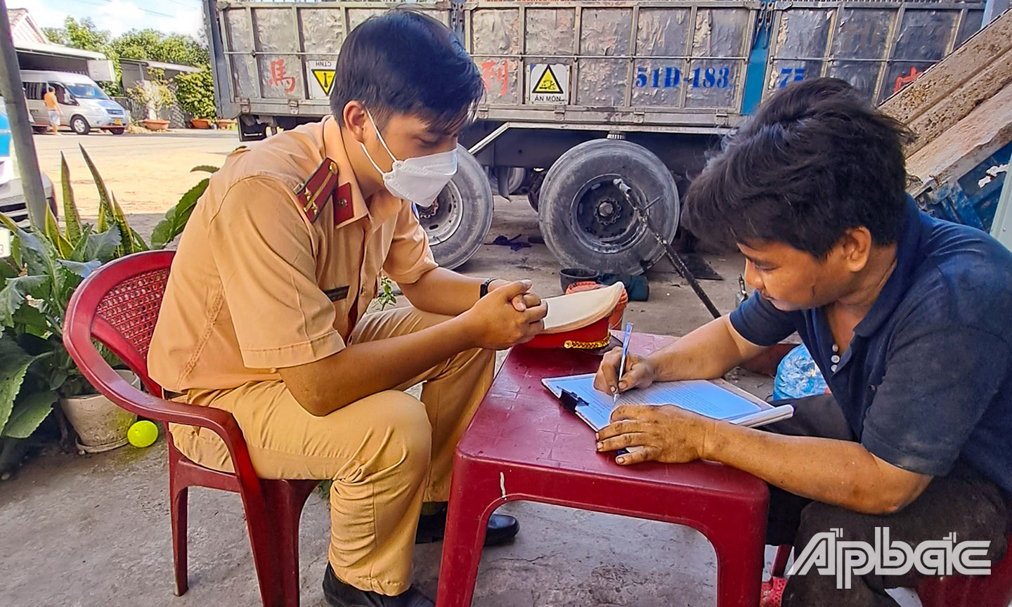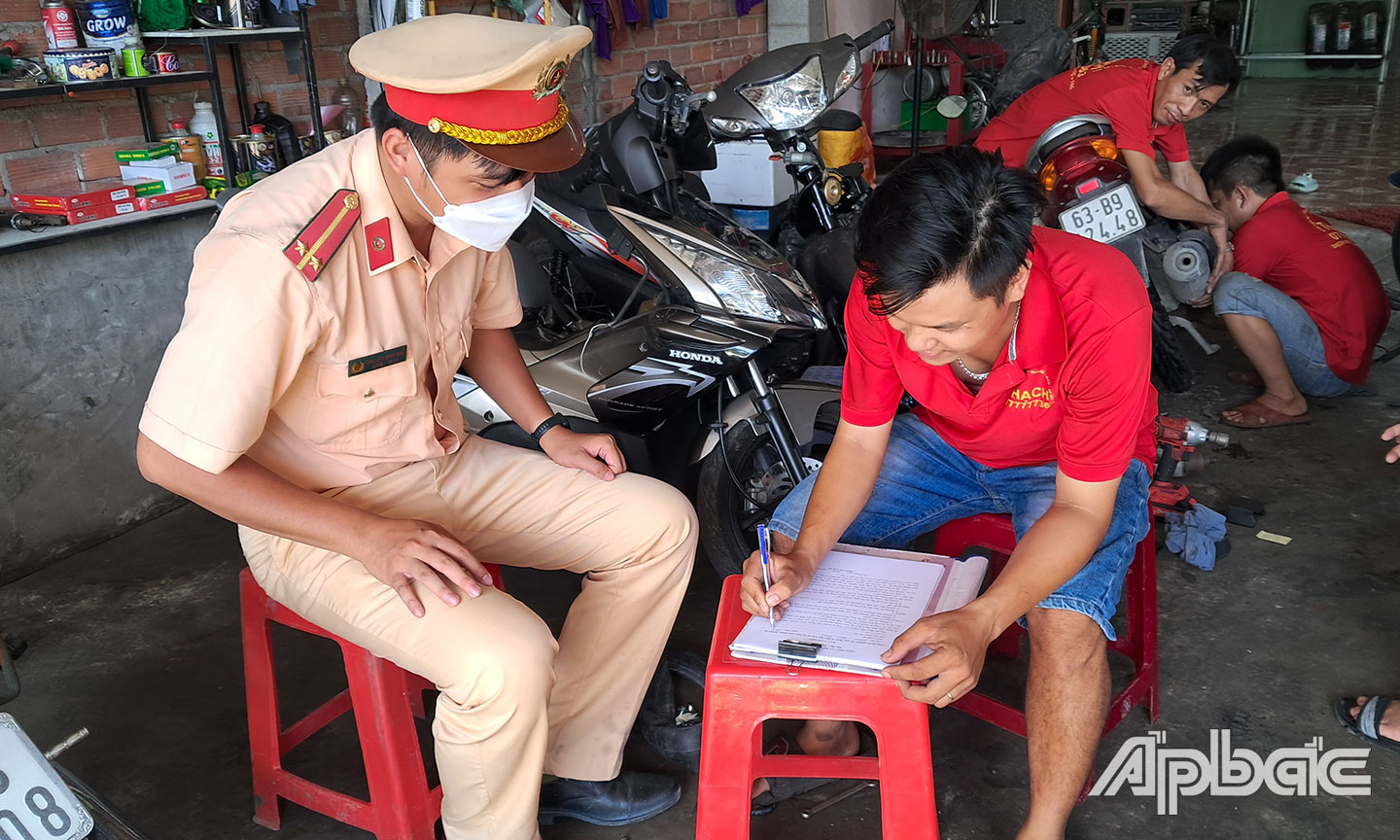 | Cán bộ CSGT-TT Công an huyện Tân Phước cho chủ cơ sở ký cam kết. |