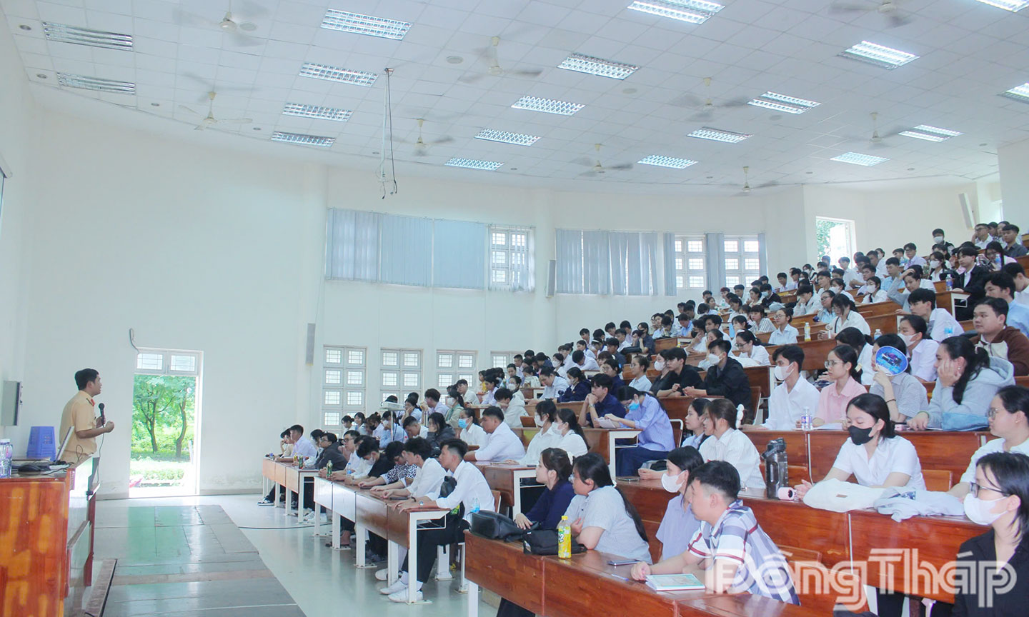 Cụ thể, tại Trường Cao đẳng Y tế Tiền Giang, Phòng Cảnh sát giao thông Công an tỉnh Đồng Tháp tổ chức buổi tuyên truyền, phổ biến pháp luật về trật tự ATGT cho hơn 700 sinh viên đang học tại trường.