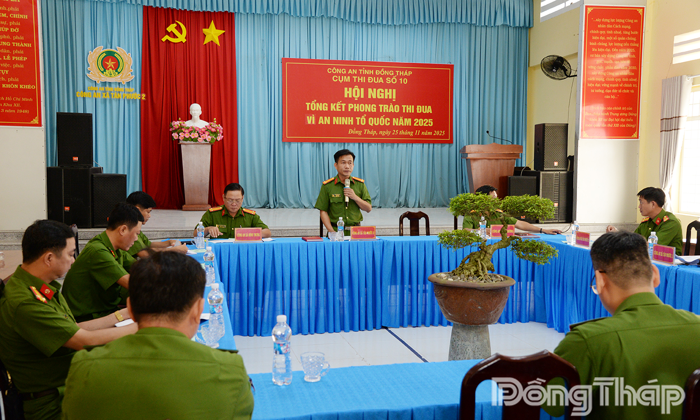 (ĐTO) Cụm thi đua số 10 thuộc Công an tỉnh Đồng Tháp vừa tổng kết phong trào thi đua "Vì an ninh Tổ quốc" năm 2025 với nhiều kết quả ấn tượng. Tội phạm hình sự giảm 64 vụ so cùng kỳ, tỷ lệ điều tra làm rõ đạt 95,2%, tai nạn giao thông giảm 14,3%, góp phần giữ vững an ninh chính trị, trật tự an toàn xã hội trên địa bàn.