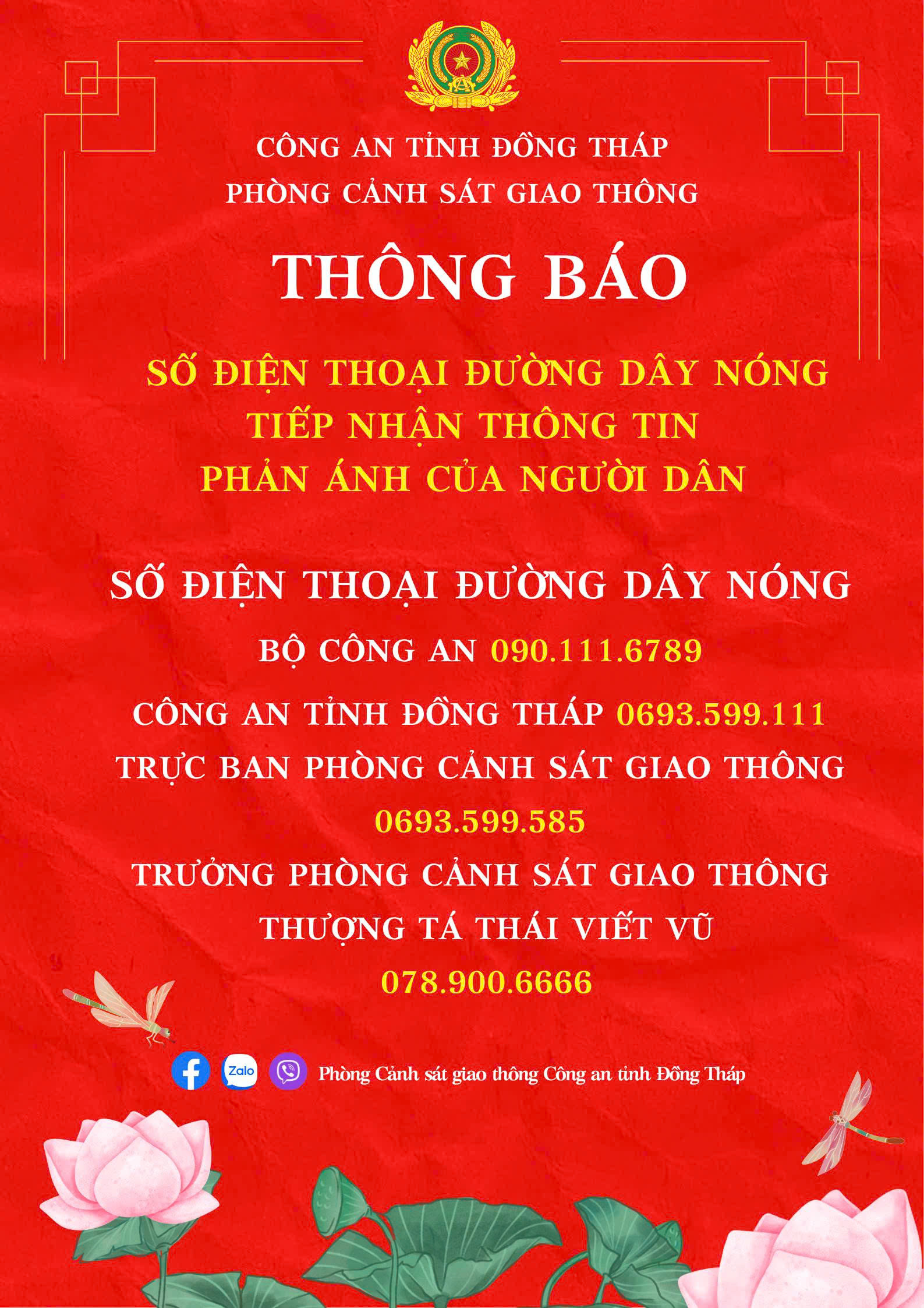 Theo thông báo từ Phòng CSGT Công an tỉnh Đồng Tháp, hệ thống đường dây nóng sẽ hoạt động liên tục để kịp thời tiếp nhận, xử lý các phản ánh của người dân về tình hình trật tự, an toàn giao thông.