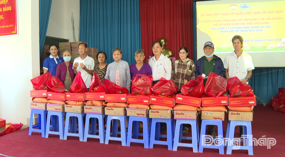 Mỗi phần quà trị giá 500 ngàn đồng gồm gạo, mì, nhu yếu phẩm, bánh, mứt. Trong đó, Công ty Cổ phần Vĩnh Hoàn tài trợ 300 phần; Bà Phạm Huỳnh Mai – Vựa Mít Huỳnh Mai tài trợ 300phần và bà Võ Thị Tâm – Đại lý nông dược Trung Tâm tài trợ 43 phần.
