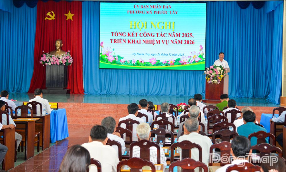 (ĐTO) Sáng 24-12, phường Mỹ Phước Tây, tỉnh Đồng Tháp tổng kết năm 2025 và triển khai phương hướng nhiệm vụ năm 2026. Đồng chí Phan Phùng Phú, Ủy viên Ban Thường vụ Tỉnh ủy, Bí thư Đảng ủy, Chủ tịch HĐND phường Mỹ Phước Tây dự và phát biểu chỉ đạo hội nghị.