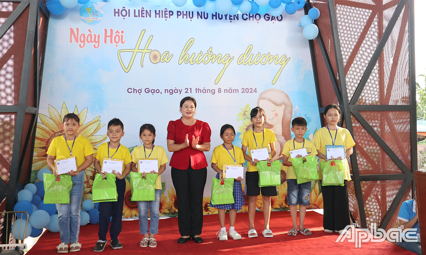 Cụ thể như tại Ngày hội “Hoa hướng dương”, Ban Thường vụ Hội LHPN huyện Chợ Gạo đã trao học bổng cho 40 trẻ mồ côi, mỗi suất học bổng trị giá 600 ngàn đồng và tặng 15 thẻ bảo hiểm y tế cho trẻ em có hoàn cảnh khó khăn, mỗi thẻ trị giá 884 ngàn đồng. Ngoài ra, các em còn được tặng thêm 10 quyển tập, 1 lốc sữa và 2 phần bánh.