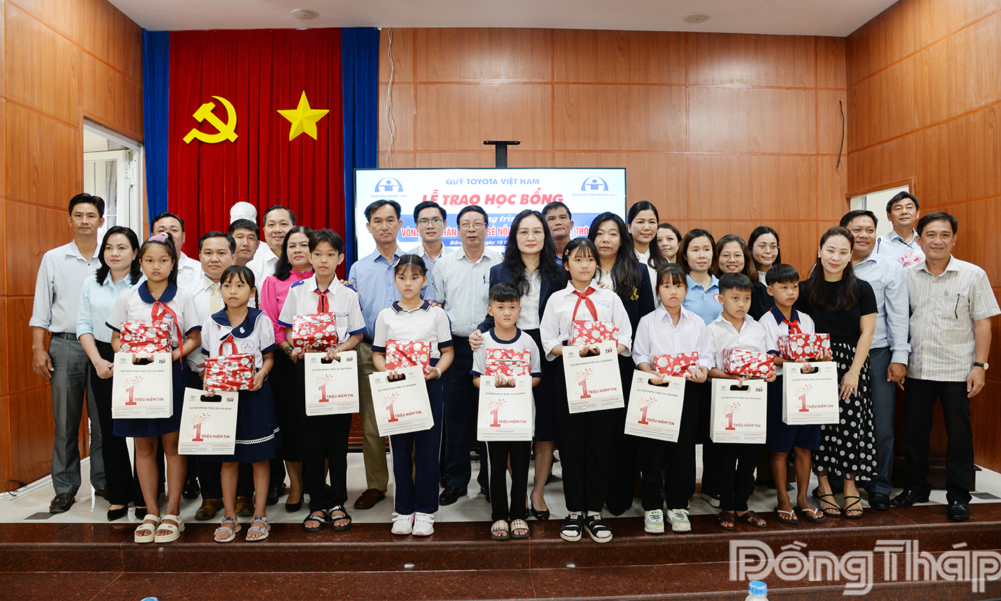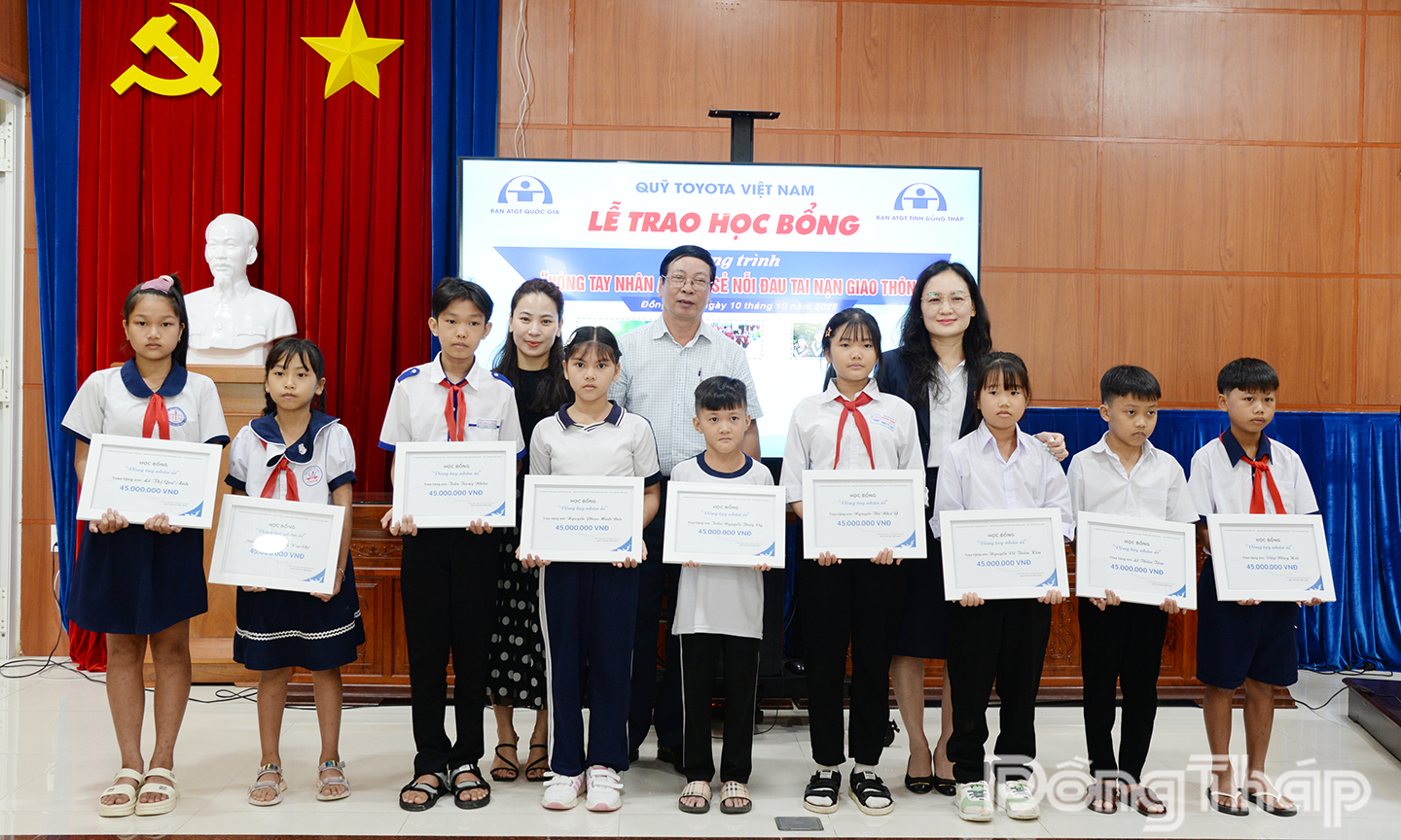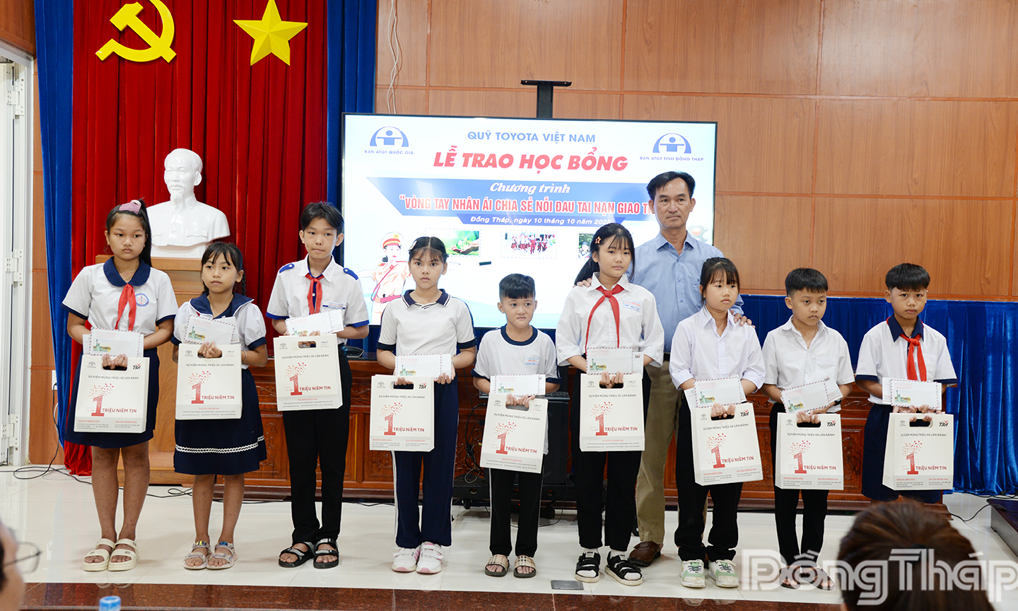 (ĐTO) Sáng ngày 10-10, Ban An toàn giao thông tỉnh Đồng Tháp phối hợp Quỹ Toyota Việt Nam tổ chức lễ trao tặng học bổng "Vòng tay nhân ái" cho 9 học sinh có hoàn cảnh khó khăn, con em các nạn nhân tai nạn giao thông trên địa bàn tỉnh.
