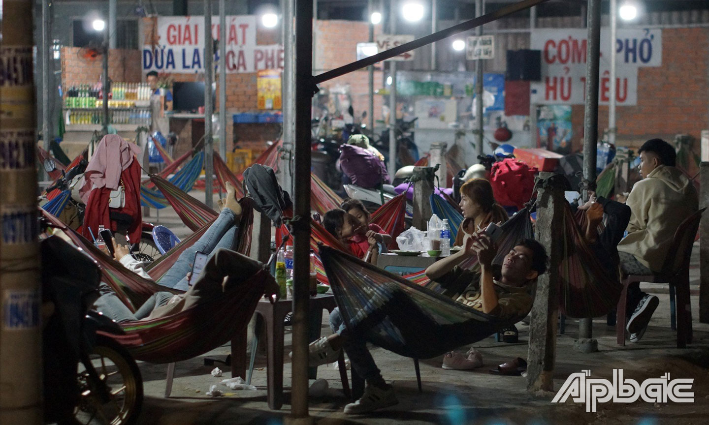 | Người dân tranh thủ nghỉ ngơi bên đường để tiếp tục hành trình về quê ăn tết. |