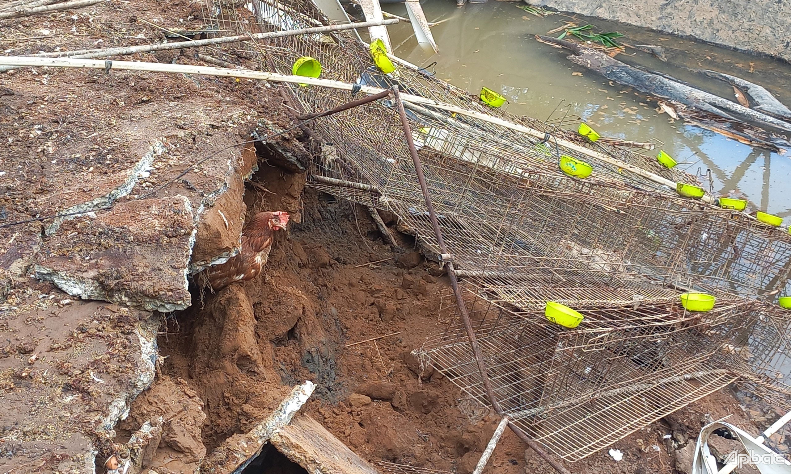 Vụ sạt lở đã nhấn chìm một phần chuồng trại, bờ kè, cây cối xuống sông và làm chết khoảng 10.000 con gà đang đẻ trứng.