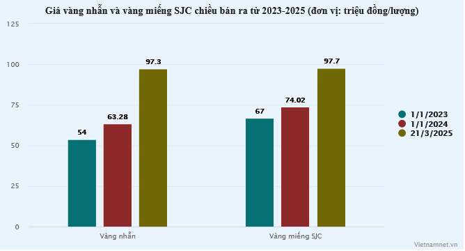 Tương tự, giá vàng nhẫn ngày 1-1-2023 chỉ ở ngưỡng 54 triệu đồng/lượng chiều bán ra, đến ngày 19-3-2025 vọt lên 100 triệu đồng/lượng, tăng khoảng 46 triệu đồng/lượng (tương đương mức tăng 85%).