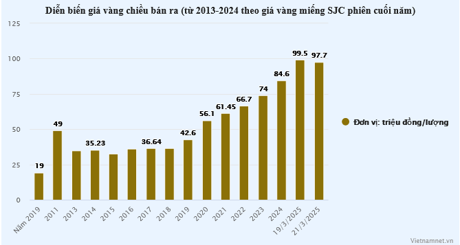 Nhiều năm đi ngang sau cú sụt giảm cuối 2011, giá vàng chỉ thực sự có cơn sốt mới vào cuối năm 2023. Giá vàng miếng SJC ghi nhận trong phiên giao dịch đầu năm 2023 ở mức 67 triệu đồng/lượng (bán ra). Chỉ hơn hai năm sau, ngày 19-3-2025, giá vàng miếng đã vượt 100 triệu đồng/lượng, tăng 33 triệu đồng/lượng (tương đương tăng 49,3%).