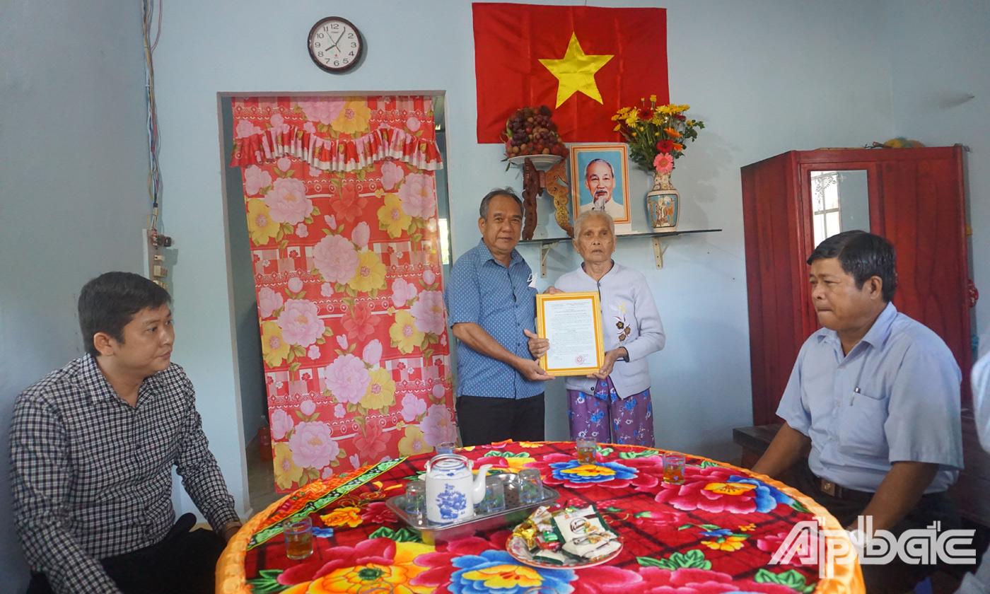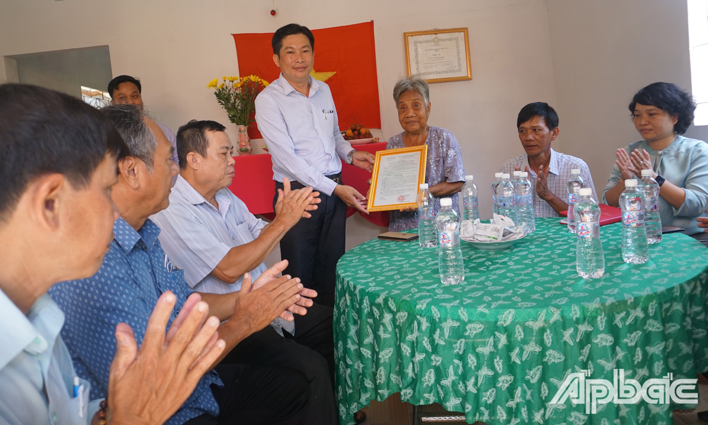 | Bàn giao nhà cho gia đình bà Võ Thị Của (vợ liệt sĩ Nguyễn Văn Dưỡng, xã Thạnh Phú). |