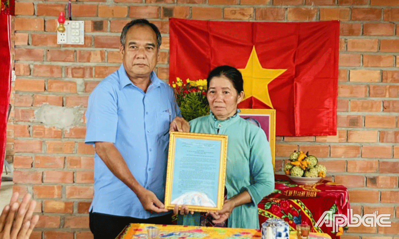 | Bàn giao nhà cho gia đình Nguyễn Thị Cang (vợ liệt sĩ, xã Mỹ Hạnh Đông, TX. Cai Lậy). |