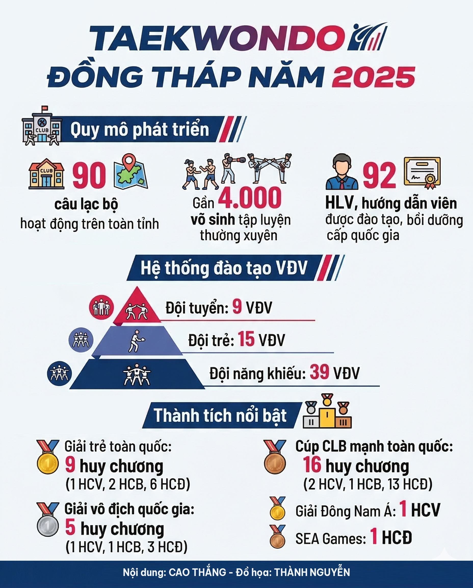 Từ những lớp võ ở cơ sở đến đấu trường khu vực và quốc tế, Taekwondo Đồng Tháp đang từng bước khẳng định vị thế của mình, góp phần xây dựng thế hệ trẻ khỏe mạnh, kỷ luật và đầy bản lĩnh.