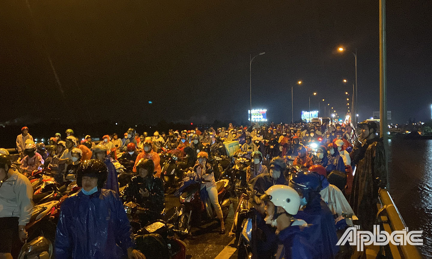 | Giao thông tê liệt trên cầu Rạch Miễu. |