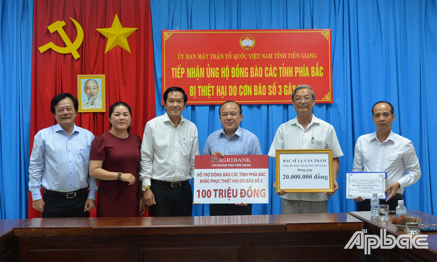 Những ngày này, tại cơ quan Ủy ban MTTQ Việt Nam từ tỉnh đến các huyện, thị xã, thành phố, phường, xã trên địa bàn tỉnh Tiền Giang, các đơn vị đã và đang tiếp nhận liên tiếp nguồn đóng góp ủng hộ của đông đảo các tầng lớp nhân dân ủng hộ người dân phía Bắc khắc phục thiệt hại do cơn bão số 3. Theo thống kê từ Ủy ban MTTQ Việt Nam tỉnh Tiền Giang đến chiều ngày 20-9 đã có hơn 100 đơn vị, doanh nghiệp, cá nhân; các huyện, thành, thị đóng góp ủng hộ gần 9 tỷ đồng.