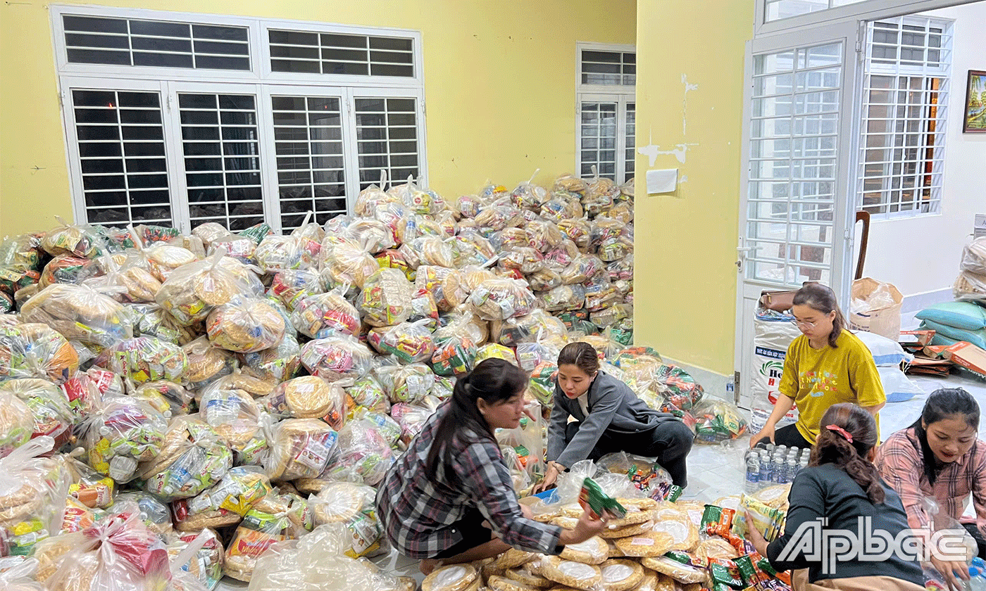 | Nhóm Tâm bất động sản Tiền Giang, Tân Phú Đông đã kết nối các đơn vị, nhà hảo tâm, nhân dân trong và ngoài tỉnh Tiền Giang đóng góp trên 1.500 phần quà kịp thời chuyển đến đồng bào bị thiệt hại do bão lũ ở các tỉnh miền Bắc vào sáng ngày 19-9. |