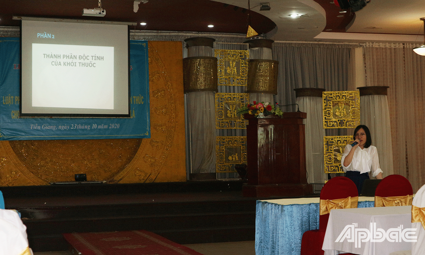 Tiến sĩ Hoàng Thị Huỳnh Diệu, Phó Giám đốc Trung tâm Kiểm soát bệnh tật tỉnh Tiền Giang trình bày các nội dung Luật Phòng, chống tác hại của thuốc lá tại hội nghị. |