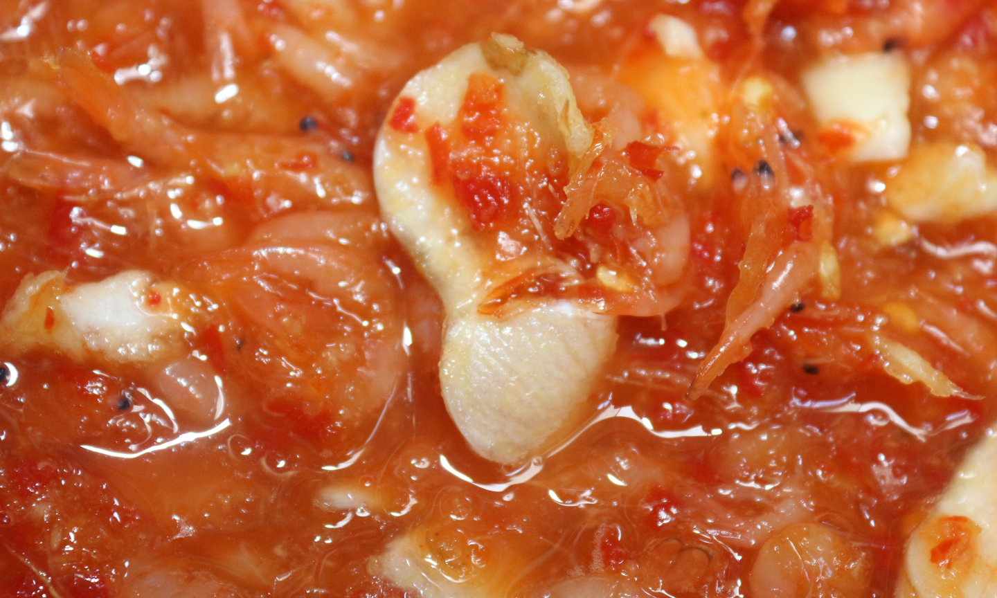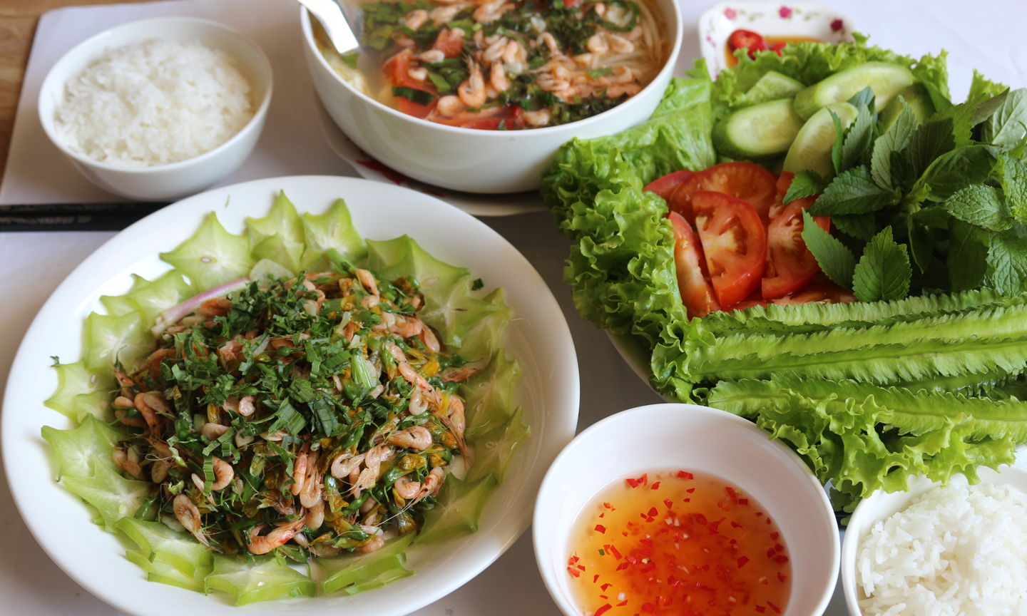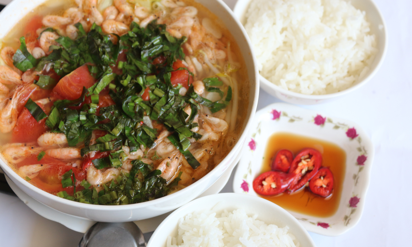 Tép được mẹ đem rửa sạch, một phần để nấu canh chua, hái thêm vài bông so đũa, thêm chút ngò gai, rau tần dày lá là được một nồi canh chua ngọt lừ và một phần dùng để kho tộ. Canh chua mà ăn với tép kho tộ thì khỏi phải chê, ăn hoài đến no căng bụng thì thôi.
